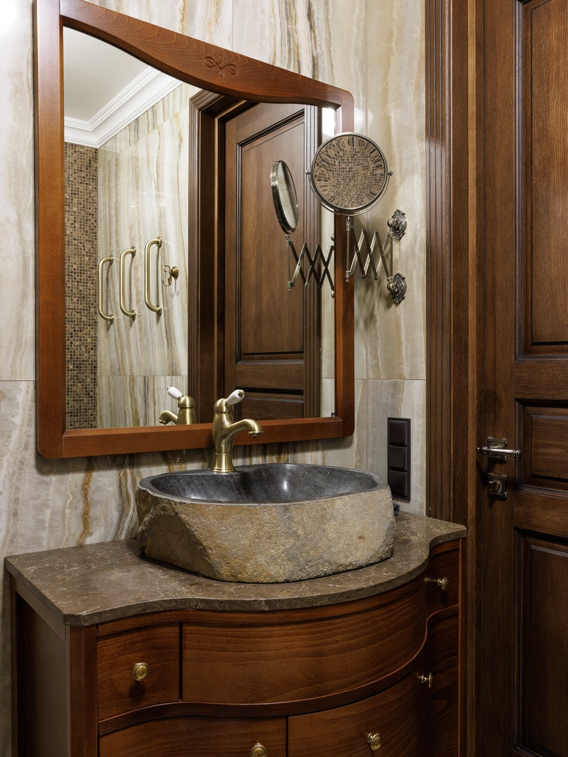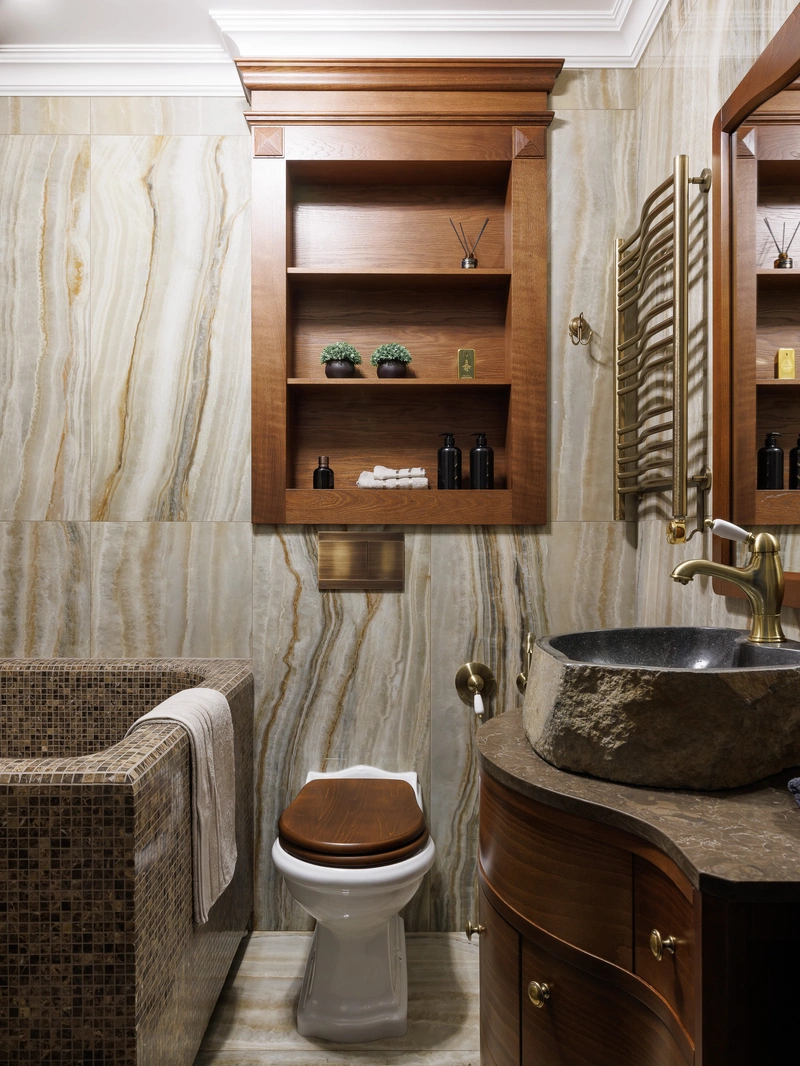 Тумба из массива дерева с каменной раковиной подчеркивает индивидуальность интерьера. Акценты в виде латунной сантехники и открытых полок создают атмосферу солидного английского стиля и делают санузел не только функциональным, но и запоминающимся.