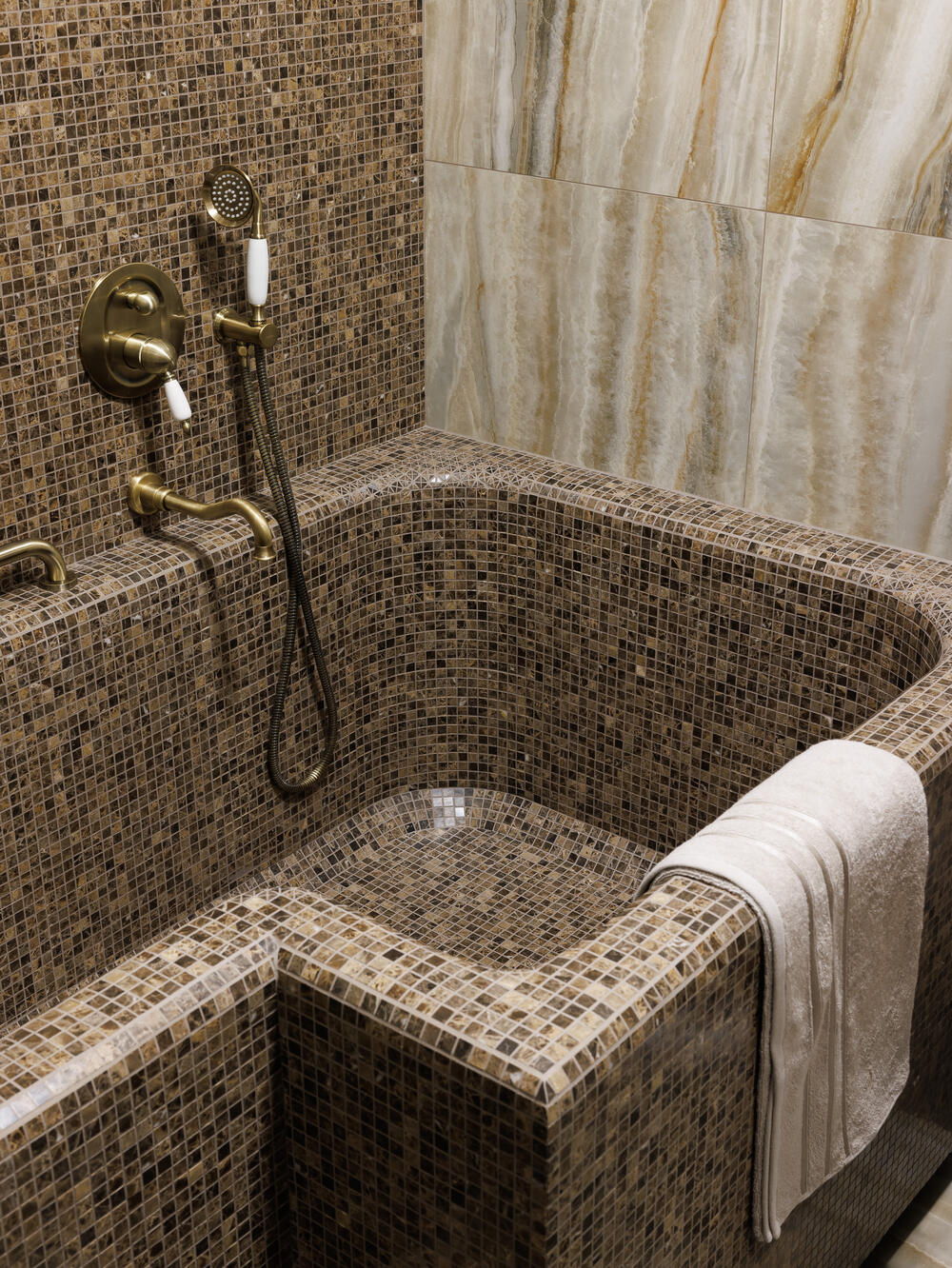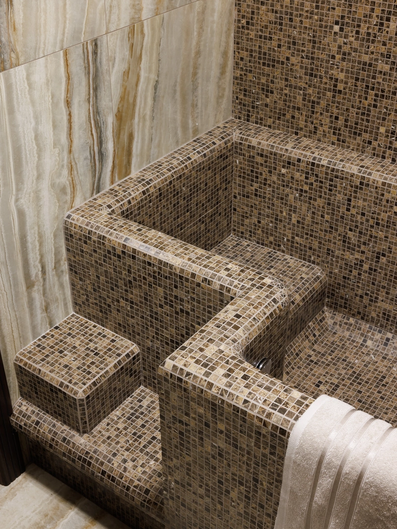 Главным пожеланием заказчика была просторная ванна, несмотря на ограниченные метры. Решением стала уникальная конструкция из бетона, облицованная мозаикой, со ступенями и сиденьем. Она занимает минимум площади, но при этом выглядит эффектно и полностью соответствует требованиям.
