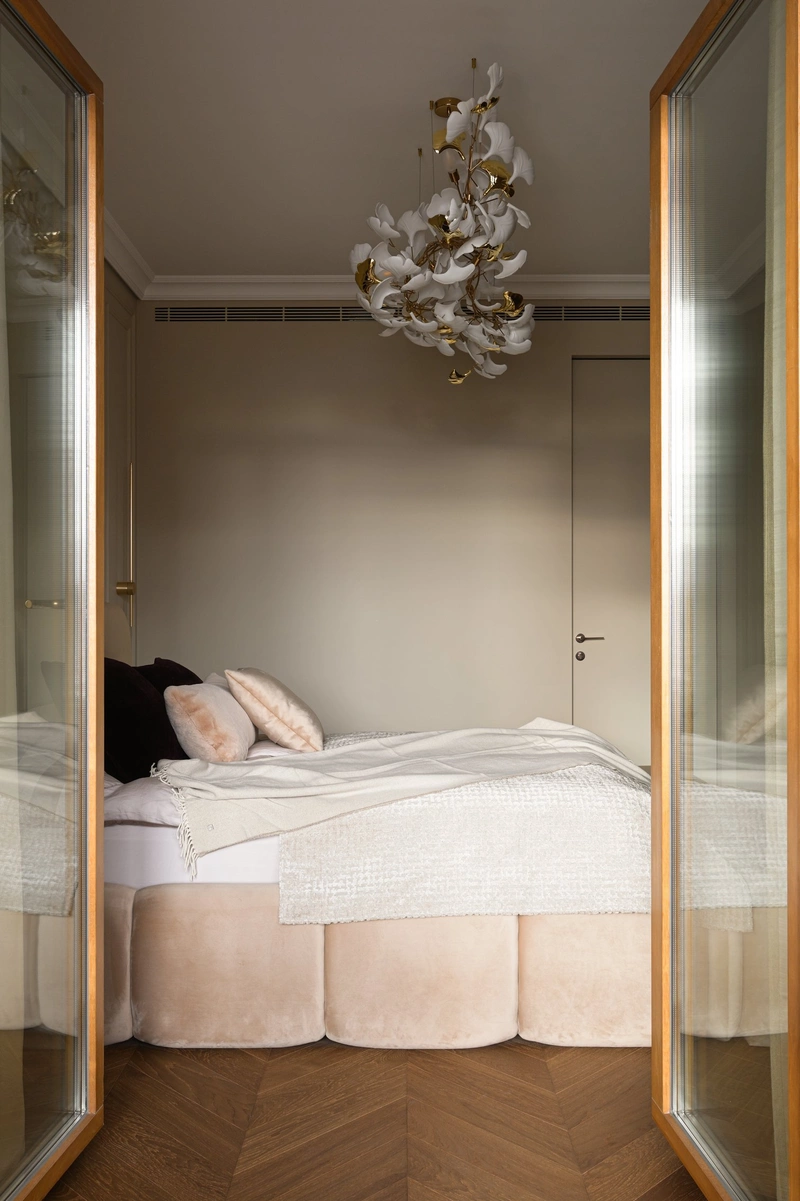 Интерьер выполнен в современной неоклассике с акцентом на статус и тактильную выразительность. В основе — светлая теплая палитра: бежевые и пудровые оттенки, мягкие древесные текстуры, светлый шпон.