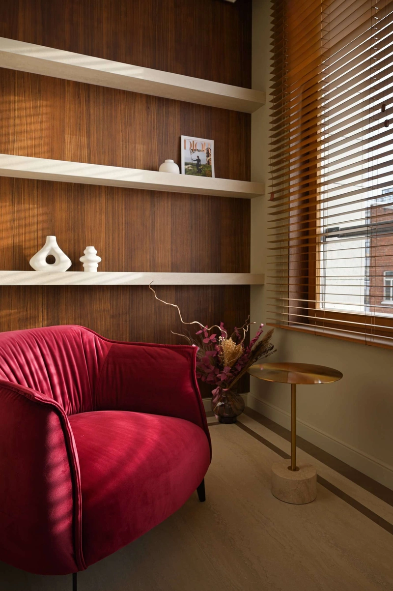 Здесь установлен столик с подсветкой и зеркалом, открытые полки для аксессуаров, косметики и декора. Предусмотрены ниши для фоторамок и памятных мелочей — как просила хозяйка. На полу — декоративный бордюр из керамогранита, по центру — мягкий пуф и кресло винного оттенка, поддерживающее акцентную палитру квартиры.