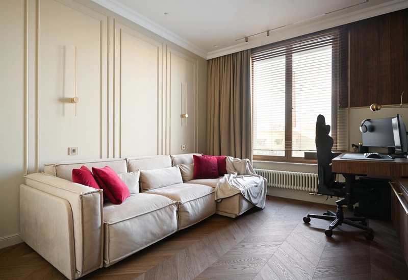 Комната задумывалась как гибкое пространство, которое может адаптироваться под разные этапы жизни. Сейчас это уютная гостиная с рабочей зоной: у окна — стол с монитором, встроенные розетки, удобное кресло. По центру — мягкий диван и ТВ-панель с декоративной подсветкой.