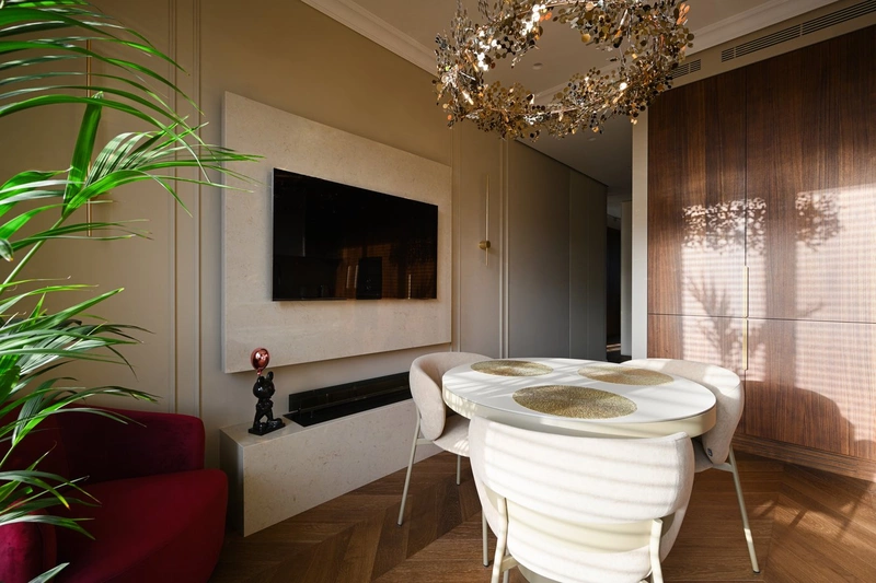 Перепланировка позволила расширить санузел и адаптировать кухню под нестандартную форму помещения. В интерьере сочетаются классические приёмы и современные материалы: гипсовые карнизы, декоративная подсветка, натуральный шпон и плюшевые текстуры. Каждый элемент работает на общий образ — спокойный, собранный, эстетичный. Квартира получилась не просто красивой, а выстроенной под конкретный образ жизни, с гибкими сценариями на будущее.