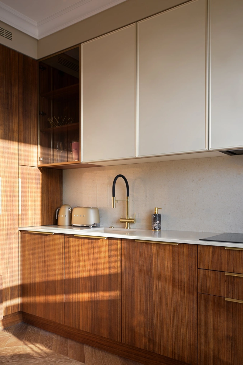 Шпон — на фасадах мебели, встроенных шкафах и скрытых дверях. Он добавляет тепла и подчеркивает статусную стилистику интерьера.