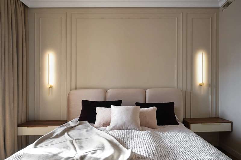 Несущую колонну обыграли: она стала частью композиции с мягким изголовьем кровати и подсветкой. Под ТВ разместили скрытые ящики. Зона ТВ подвешена на кронштейне, все провода и кабели спрятаны. Светлая палитра, мягкий текстиль и дерево в отделке усиливают атмосферу приватности.