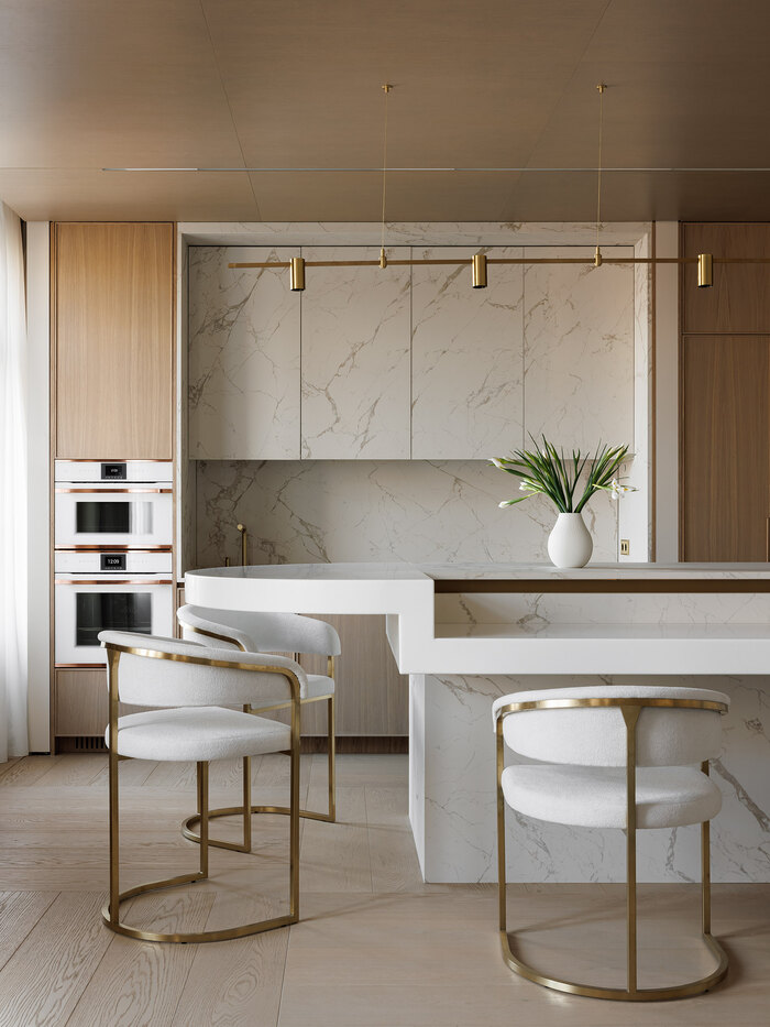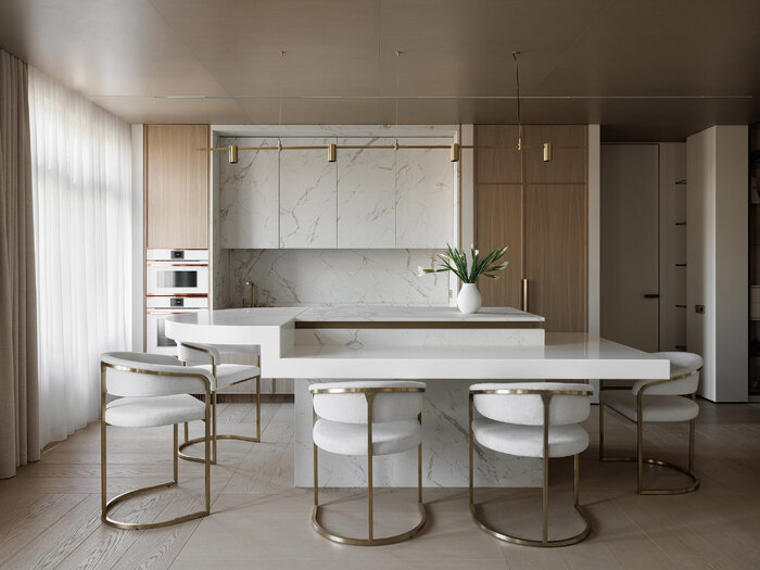 Центральное место занимает массивный остров. Мы спроектировали его так, чтобы он объединил в себе рабочую зону и удобную барную стойку для завтраков. Остров облицован камнем, что делает его визуальным якорем всего интерьера. Вся бытовая техника скрыта за лаконичными фасадами мебельных колонн. Такое решение поддерживает идеальный порядок в гостиной и подчеркивает чистоту линий.