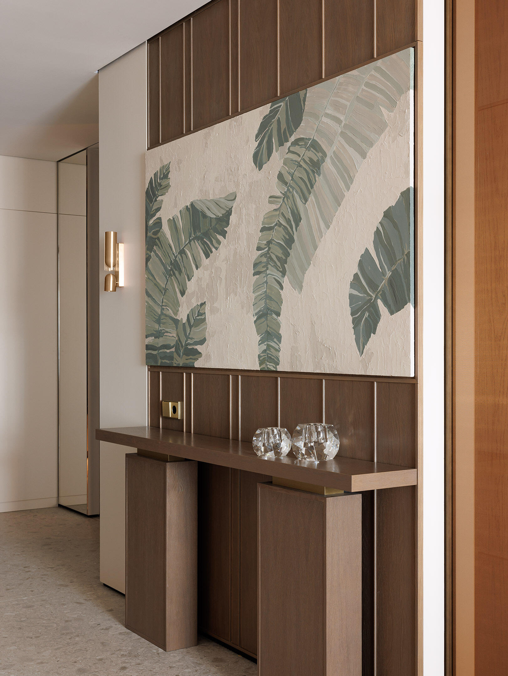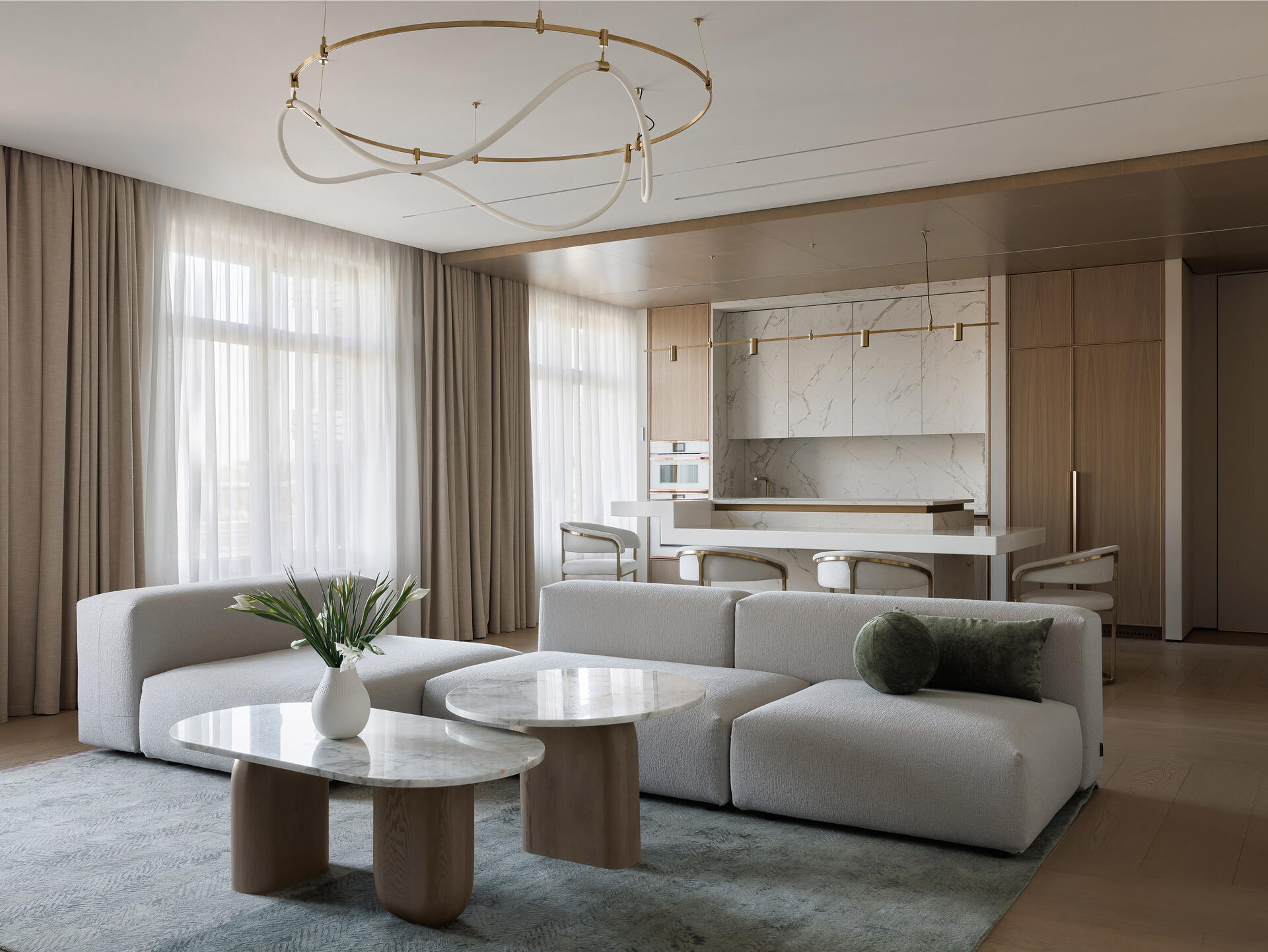 Интерьер гостиной построен на сочетании премиальных фактур и мягкой цветовой палитры. Мы использовали шпонированные деревянные панели и керамогранит, которые создают единый стиль со встроенной мебелью. Пол украшают ковры из шелка и шерсти, а мягкая мебель имеет приятную хлопковую обивку.