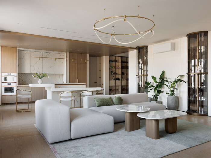 Вместо базового набора помещений мы реализовали три полноценных и независимых санузла — для хозяйки, сына и гостей, обеспечив каждому члену семьи личное пространство. Системы хранения теперь представлены тремя гардеробными, включая центральную с радиусными витринами, которая стала настоящим украшением мастер-спальни. Бытовая зона стала значительно удобнее за счет выноса постирочной в зону холла, что позволило скрыть технику и освободить ванные. Главным местом притяжения стала объединенная кухня-гостиная, пространство которой гармонично дополняет зимний сад, выделенный как приватная зона для релаксации и медитации.
