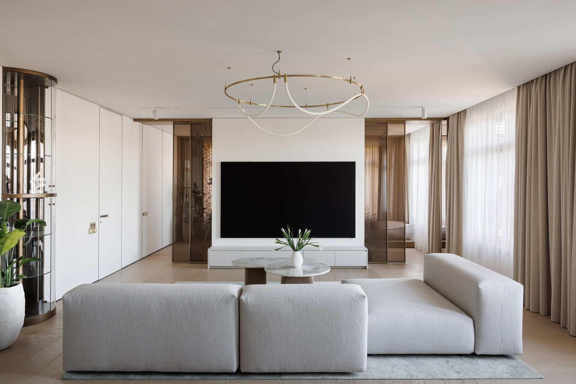 Светопрозрачные перегородки с уникальной текстильной отделкой стали важным элементом дизайна. Они пропускают максимум естественного света и позволяют в любой момент объединить гостиную с зимним садом или создать тихую зону для отдыха. Мы отказались от лишних стен и коридоров, поэтому пространство гостиной плавно перетекает в другие части квартиры и обеспечивает свободу передвижения