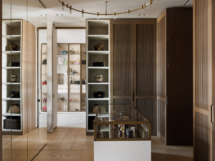 Центральным элементом зоны хранения стали роскошные радиусные витрины с прозрачными фасадами. Внутри мы использовали отделку из светлого камня и дерева, что в сочетании с внутренней подсветкой превращает гардеробную в эстетичную выставочную зону. Высокие зеркала в пол и стеклянные перегородки до потолка визуально расширяют границы комнаты и пропускают максимум естественного света из окон спальни.