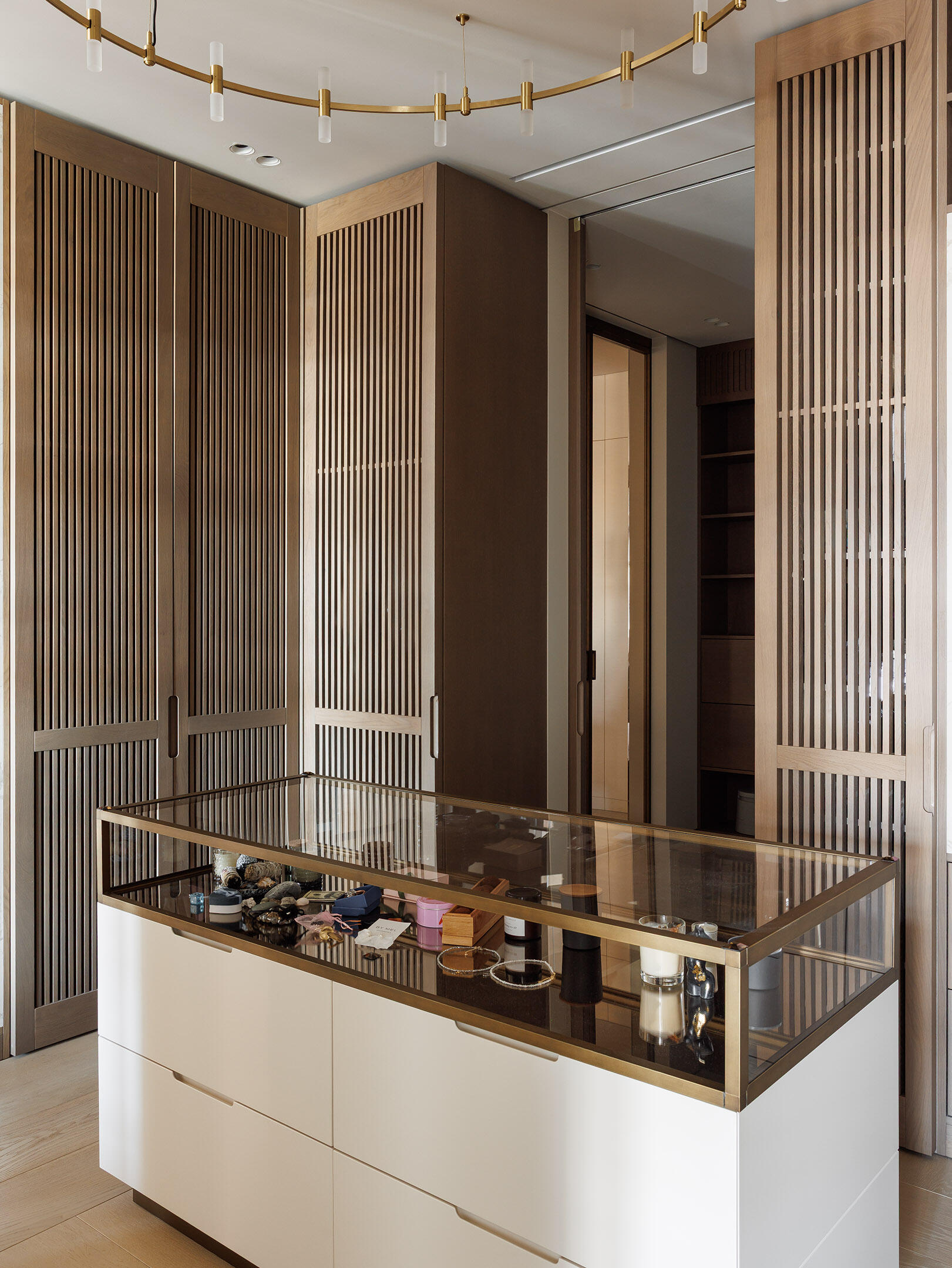 Световые акценты и радиусы. В мастер-гардеробной мы установили круглые стеклянные витрины с мягкой внутренней подсветкой. Они смотрятся очень эффектно и превращают хранение вещей в часть декора всей спальни.
