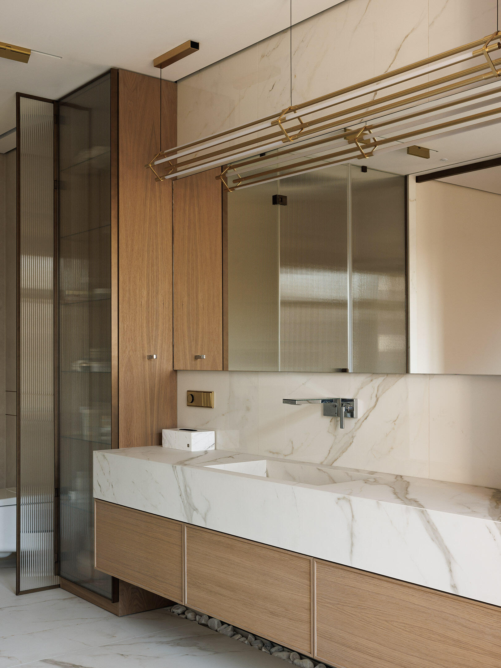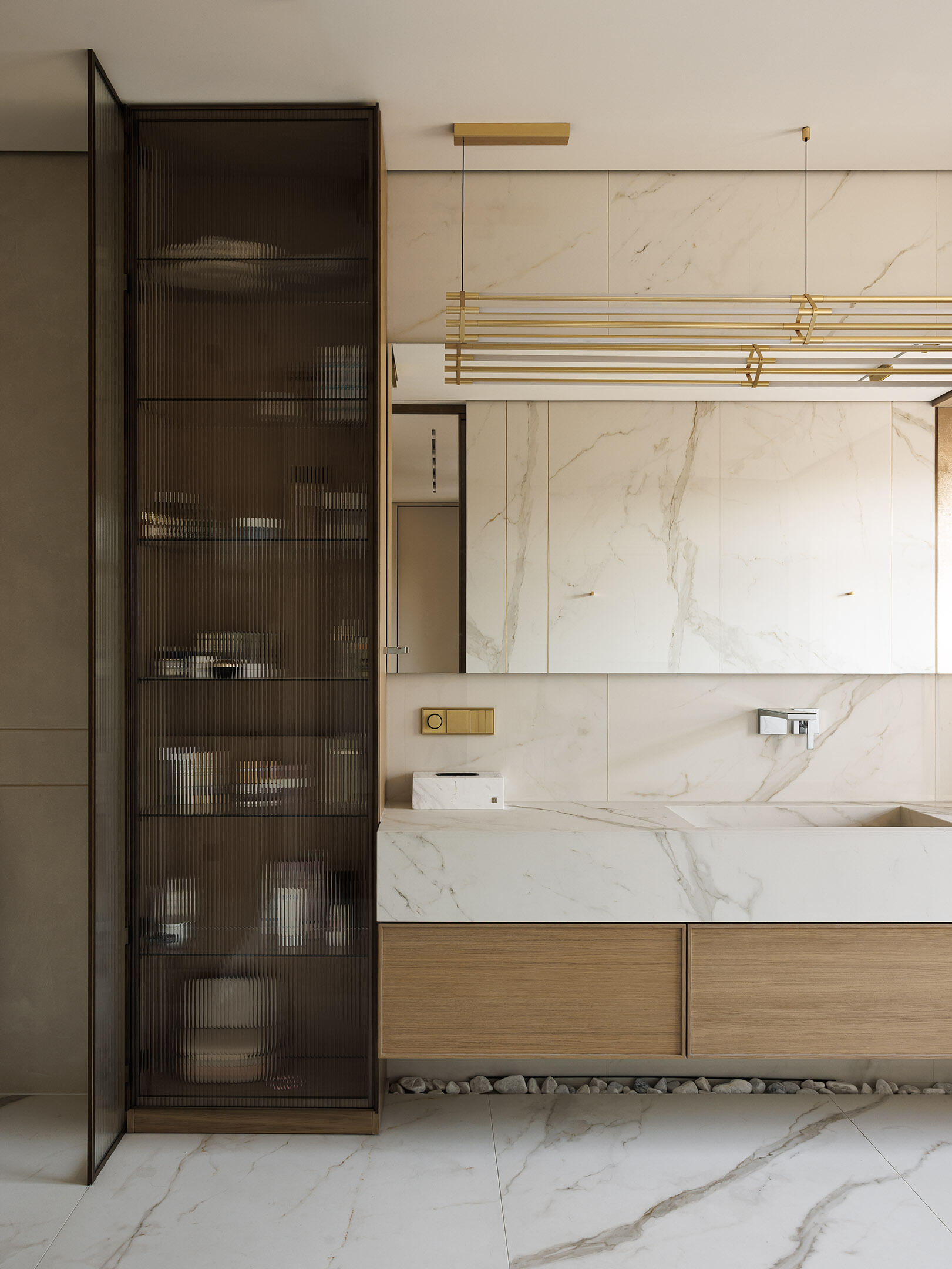 Керамогранит и камень. Эти материалы стали нашей главной фишкой в реализации мебели. Мы облицевали керамогранитом фасады кухни и часть корпусной мебели в комнатах, что создало единый архитектурный стиль. Для санузлов мы подобрали натуральный камень и износостойкий кварцевый агломерат.