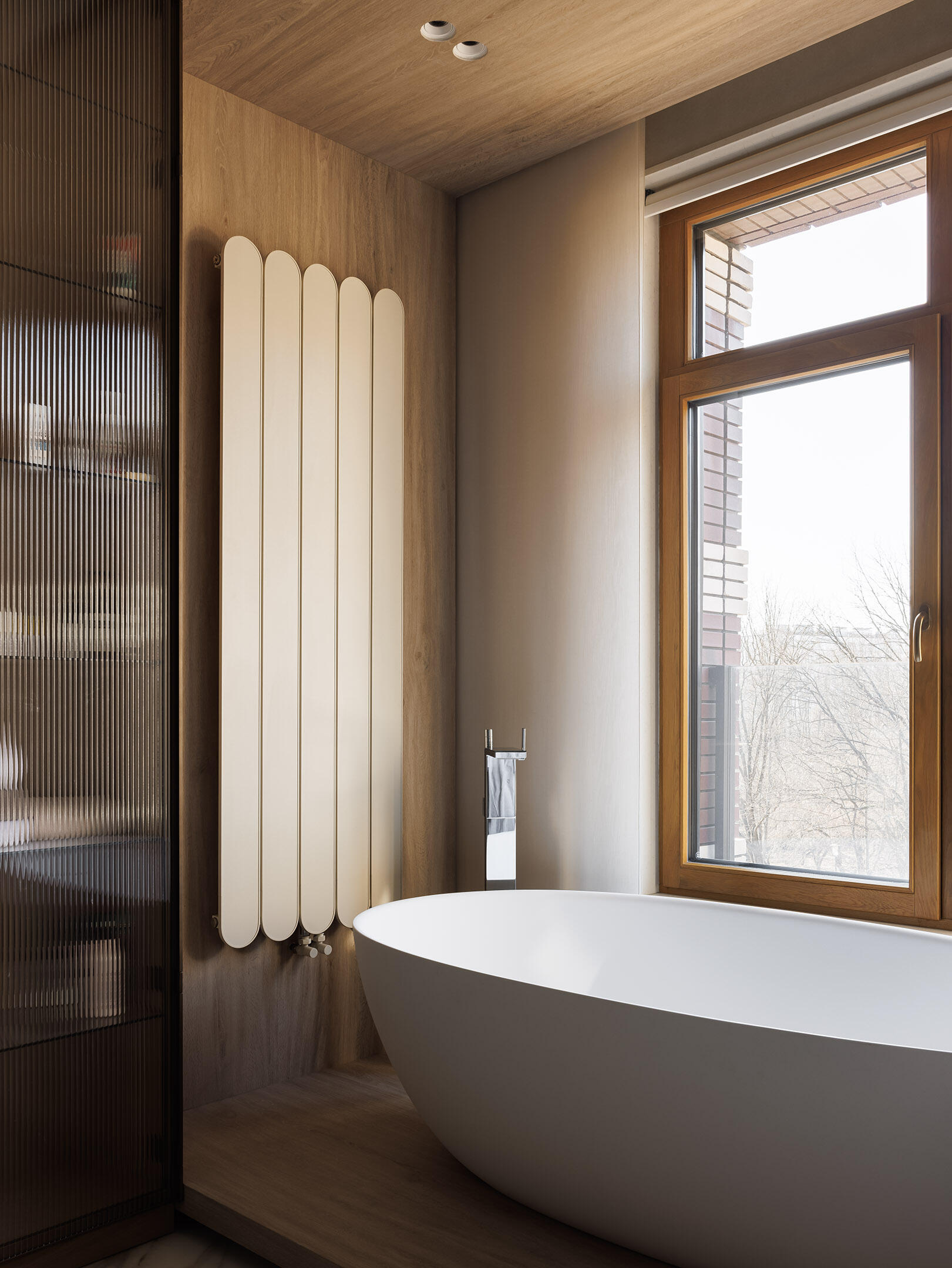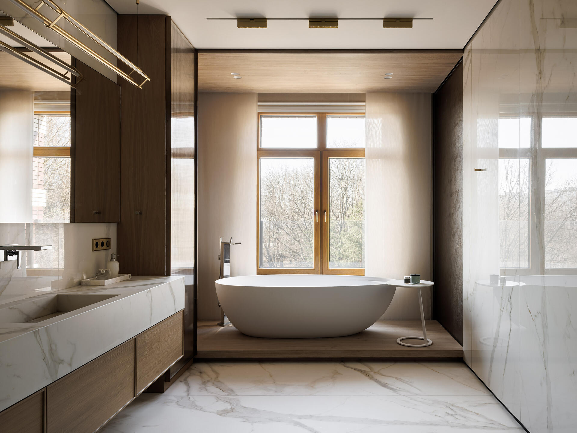 Чтобы всё это заработало, нам пришлось полностью перекроить пространство и снести старые стены. Мастер-ванную для хозяйки мы вообще перенесли в зону, где раньше была жилая комната. Это позволило поставить отдельно стоящую ванну прямо у окна на подиуме. Только представьте: натуральная галька под ногами, много света и вид из окна — получился настоящий домашний спа-курорт.