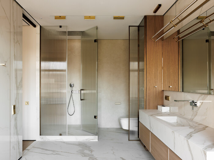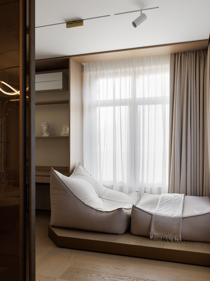 Стеклянные перегородки с секретом. Вместо обычного стекла мы использовали полотна с запеченной внутри тканью. Они выглядят очень нежно, мягко рассеивают свет и позволяют в любой момент либо открыть пространство, либо сделать его полностью приватным.