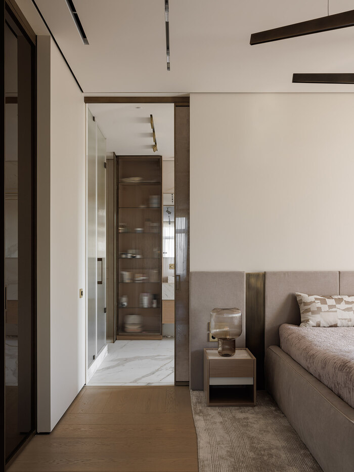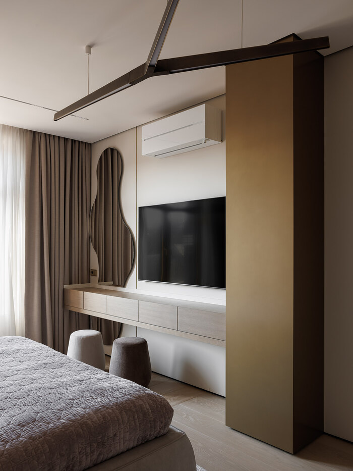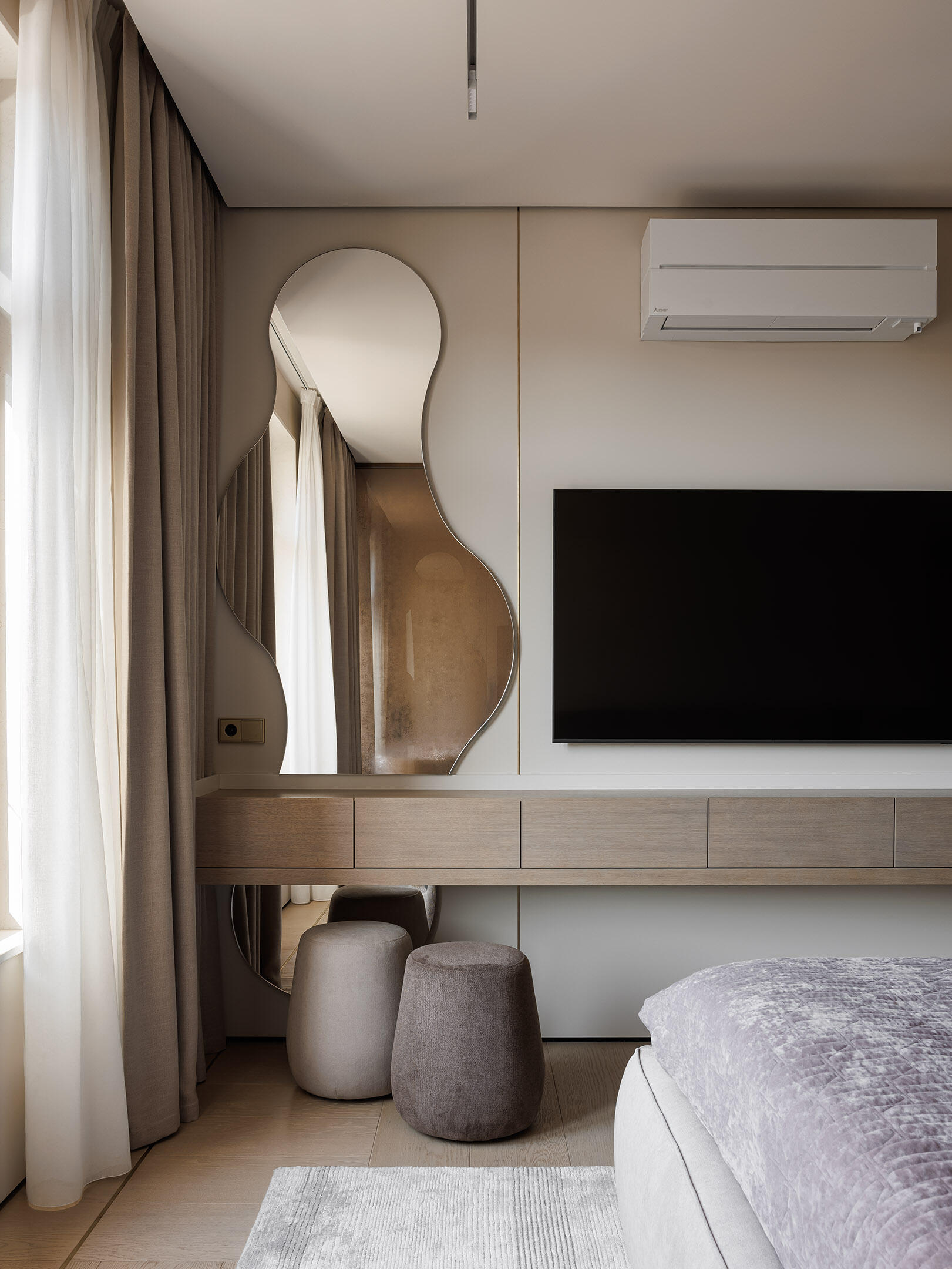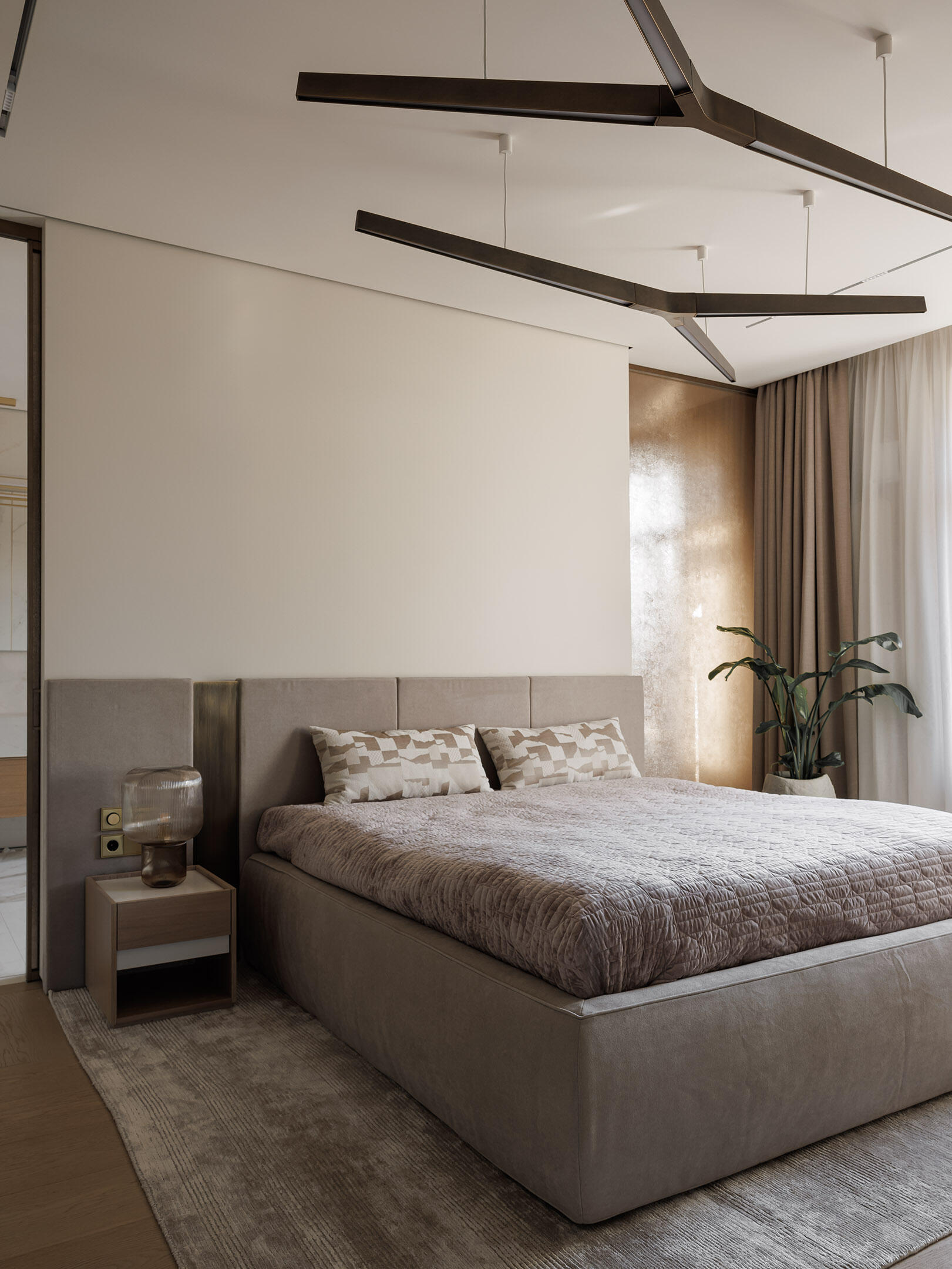 В реализованном интерьере мастер-спальня и гардеробная превратились в единое, наполненное светом пространство. Мы полностью отказались от стандартных решений и создали систему проходных зон, которые связывают спальню с холлом и личной ванной комнатой. Такое планировочное решение убрало все тупики и позволило свободно перемещаться по квартире разными путями.