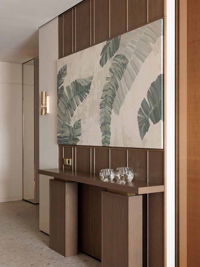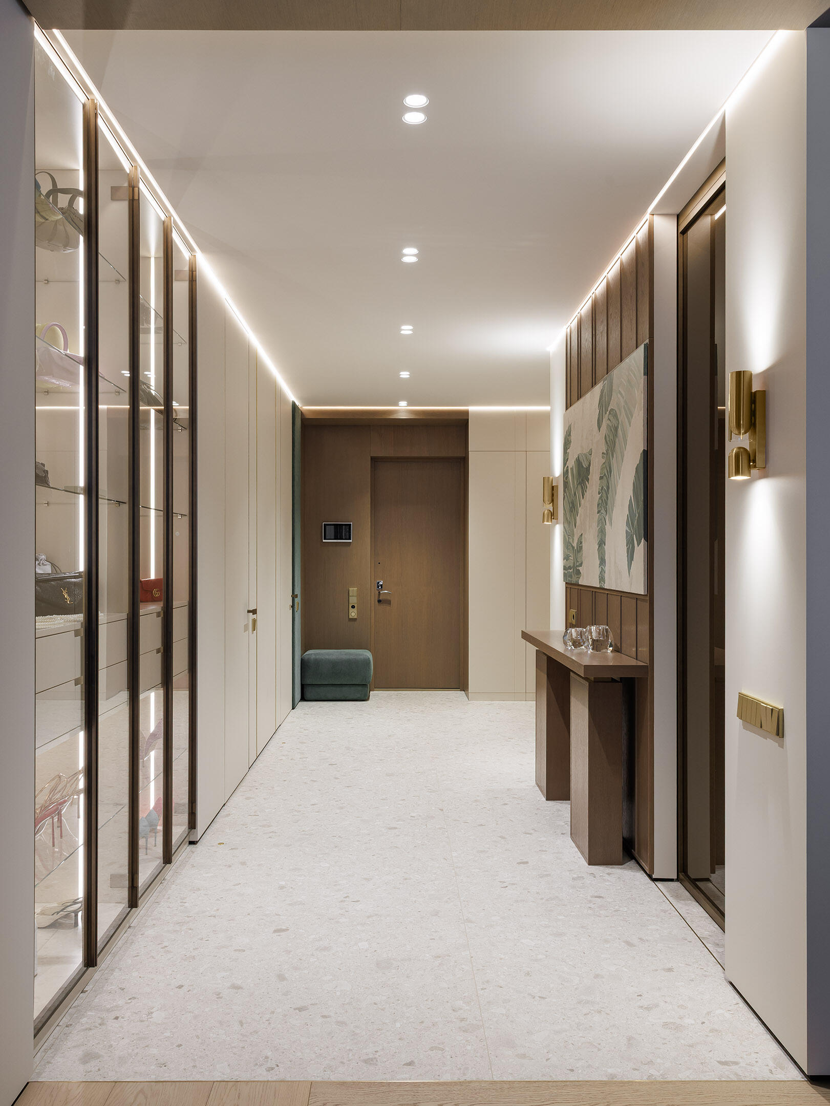 Холл в этой квартире — это первое, что видят гости, и он сразу задает планку всему проекту. Мы использовали зеркальные панели во всю высоту стен, чтобы пространство буквально «растворилось» и наполнилось светом. Вместо обычных шкафов мы встроили мебель в стены, так что она совсем не бросается в глаза.