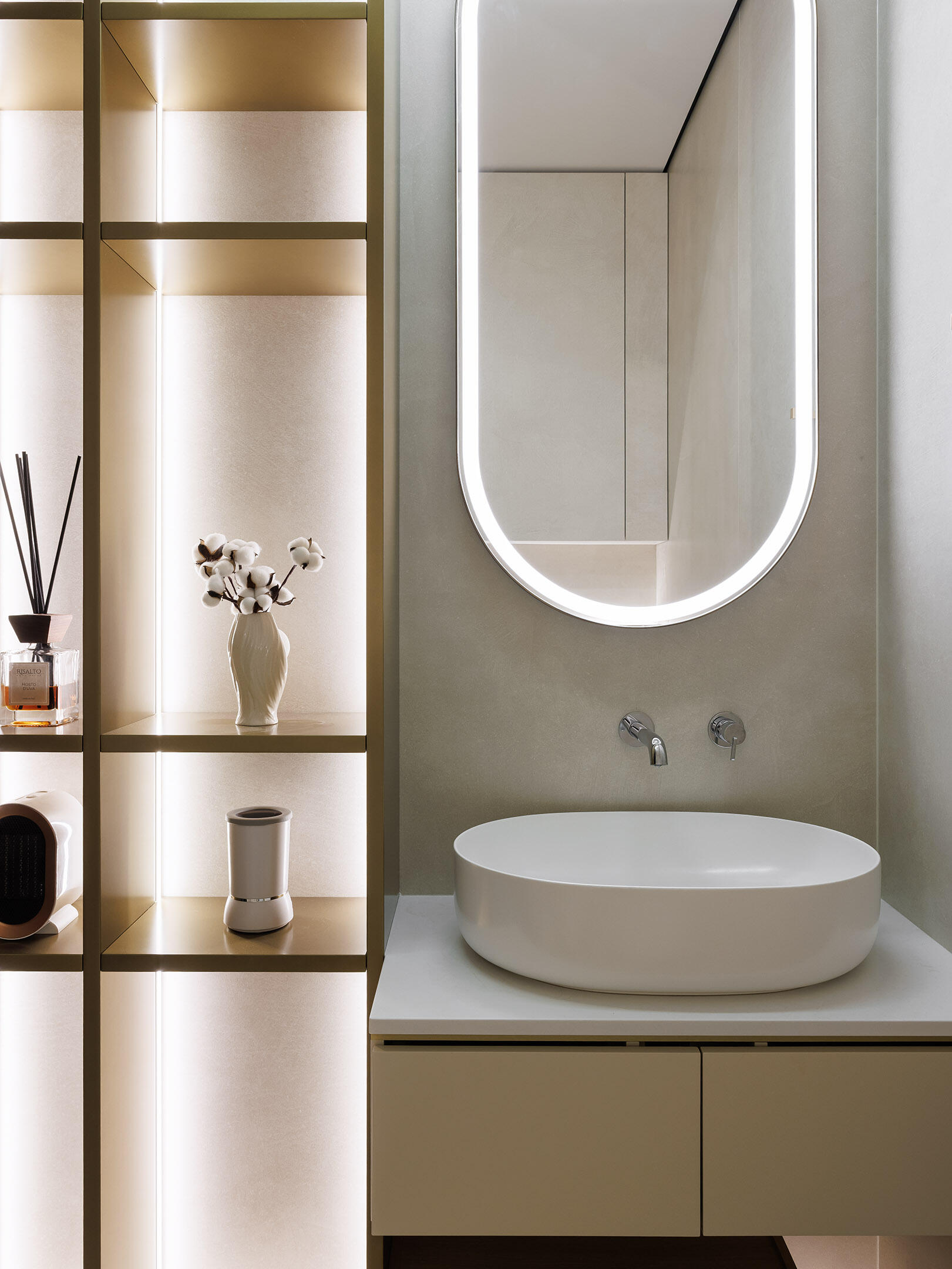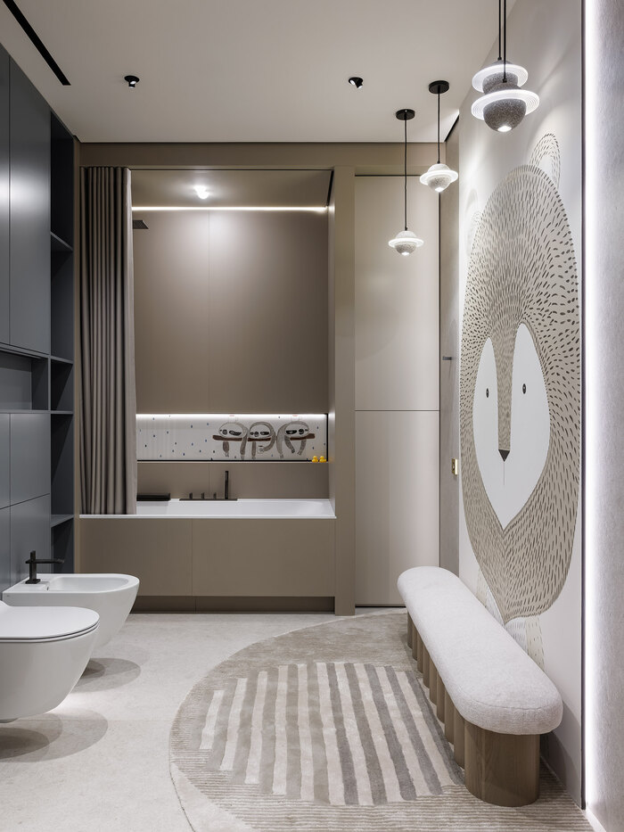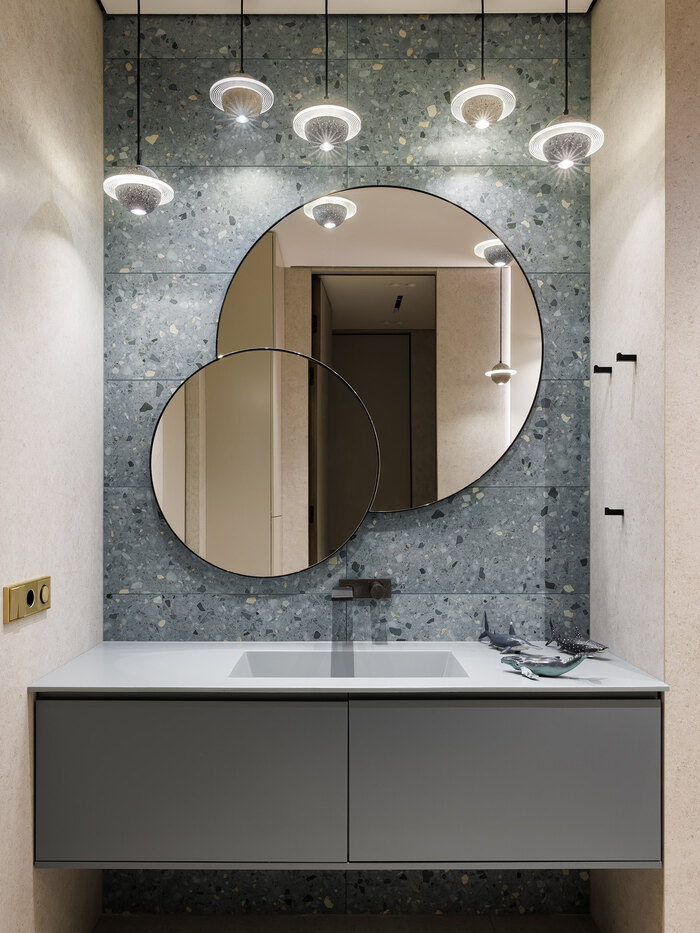В отделке использовали натуральный камень, кварцевый агломерат и крутую дизайнерскую сантехнику. В детском санузле добавили яркие акценты с помощью терраццо и необычных круглых зеркал, которые очень нравятся шесилетнему сыну хозяйки. А огромные зеркала в пол во всех ванных не просто украшают интерьер, а реально раздвигают стены и делают комнаты в два раза светлее. В итоге каждое помещение получилось со своим характером, но в общем стиле всей квартиры.