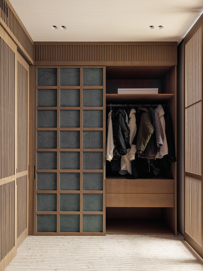 Натуральное дерево. Мы выбрали шпонированные панели для стен и потолка, а также реечные фасады в гардеробной. Дерево сразу наполняет минималистичный интерьер домашним теплом.
