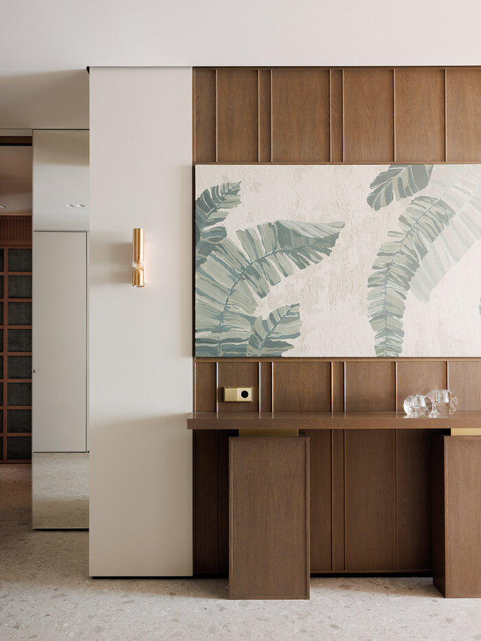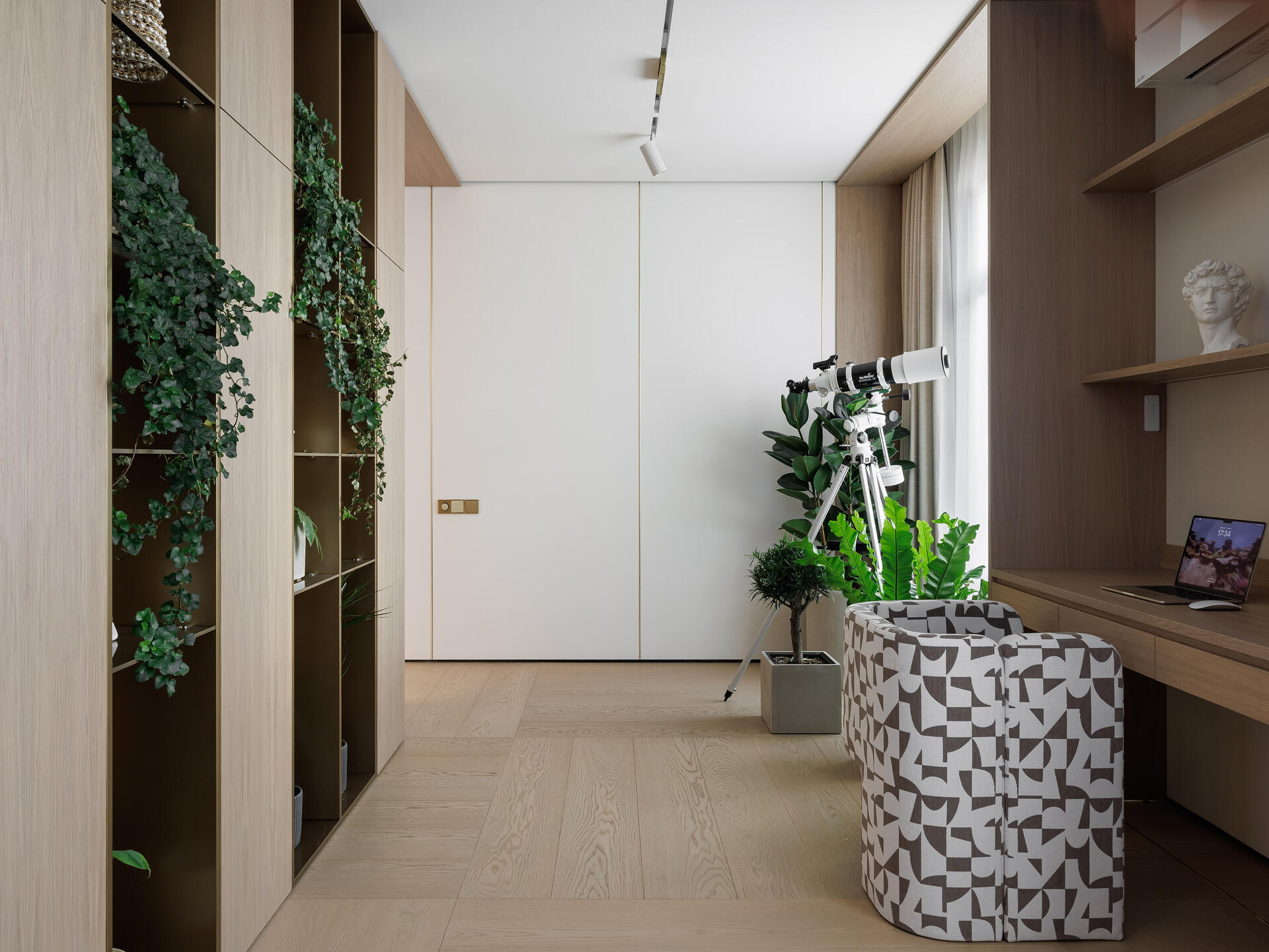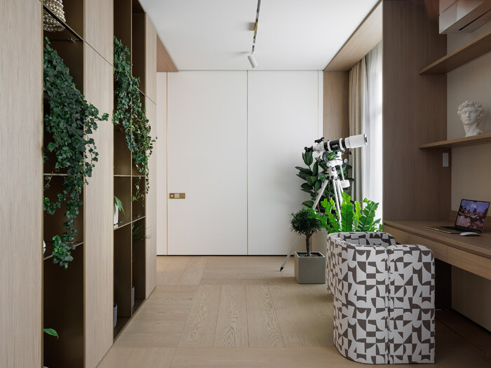 Внутри зоны отдыха мы сохранили общий стиль интерьера. Здесь шпонированные деревянные панели гармонируют с обилием дневного света. Мы убрали лишние стены и тупиковые зоны, поэтому зимний сад плавно продолжает логику всей квартиры. Это пространство стало настоящей «изюминкой» проекта, где природа и архитектура дополняют друг друга.