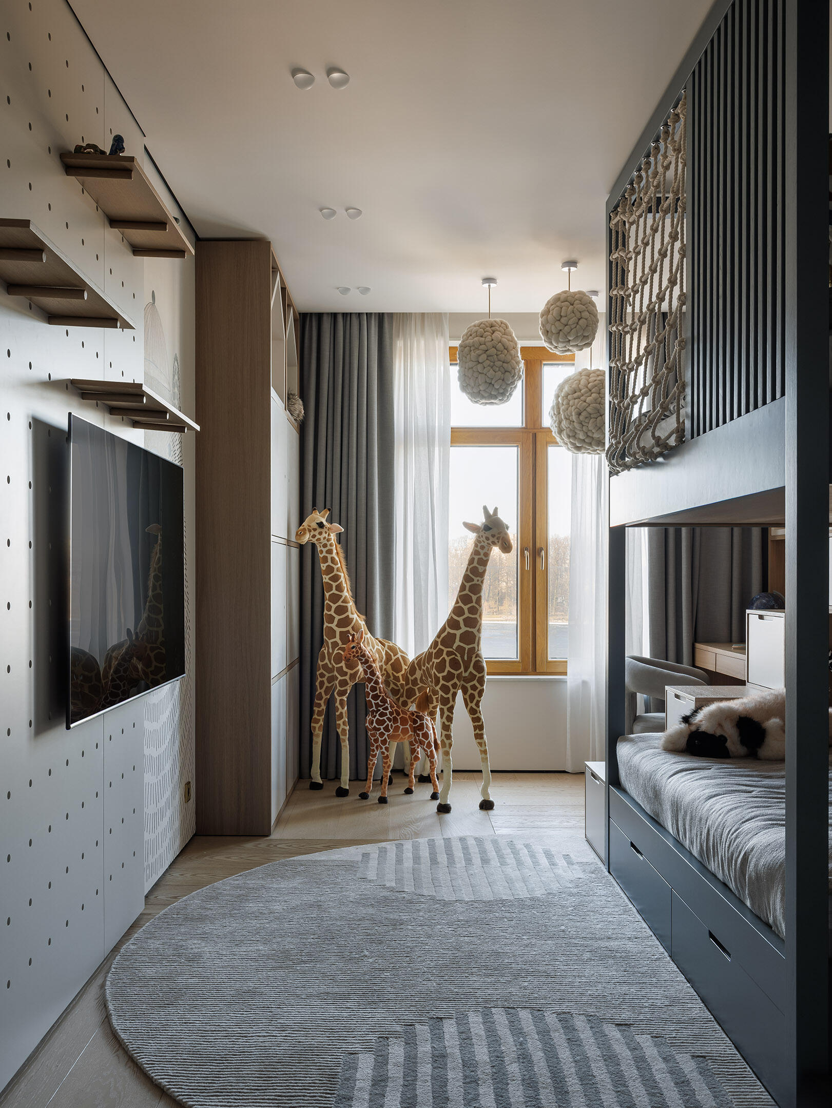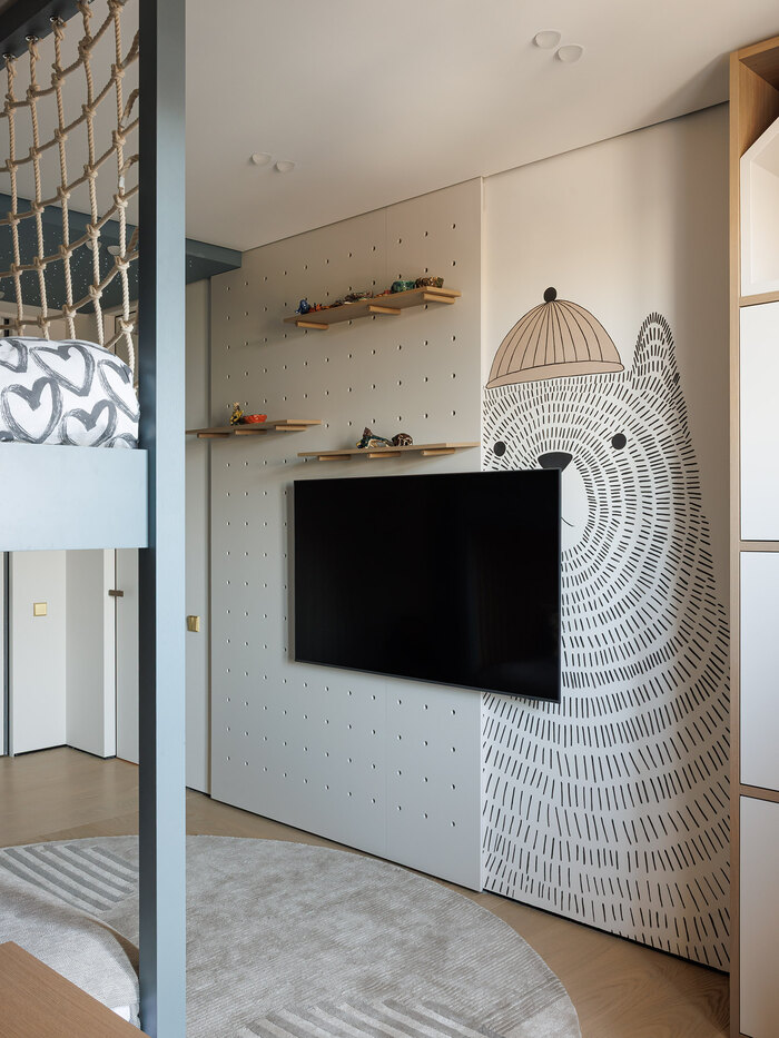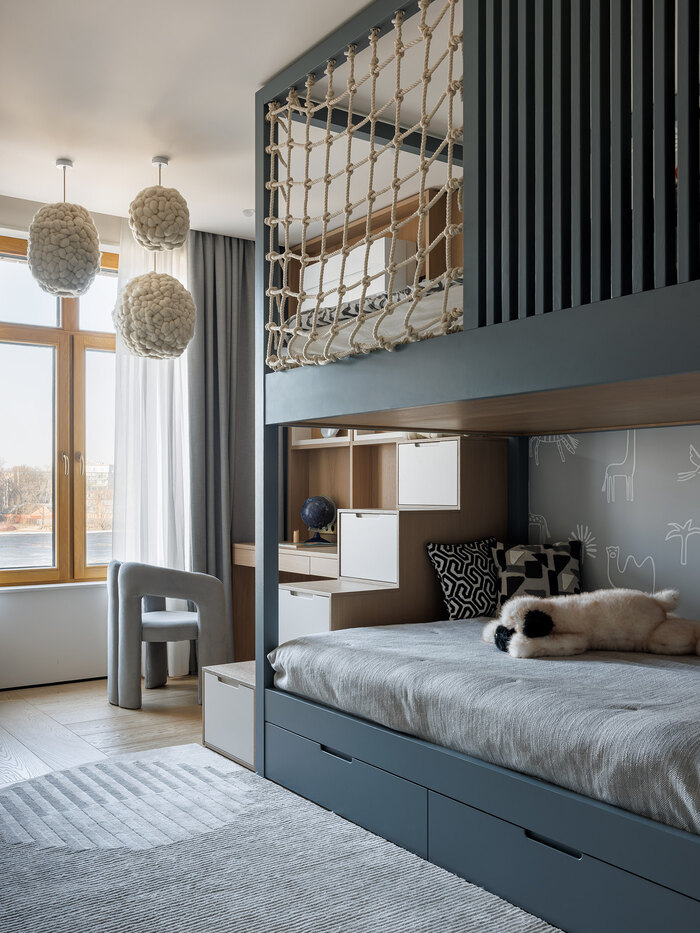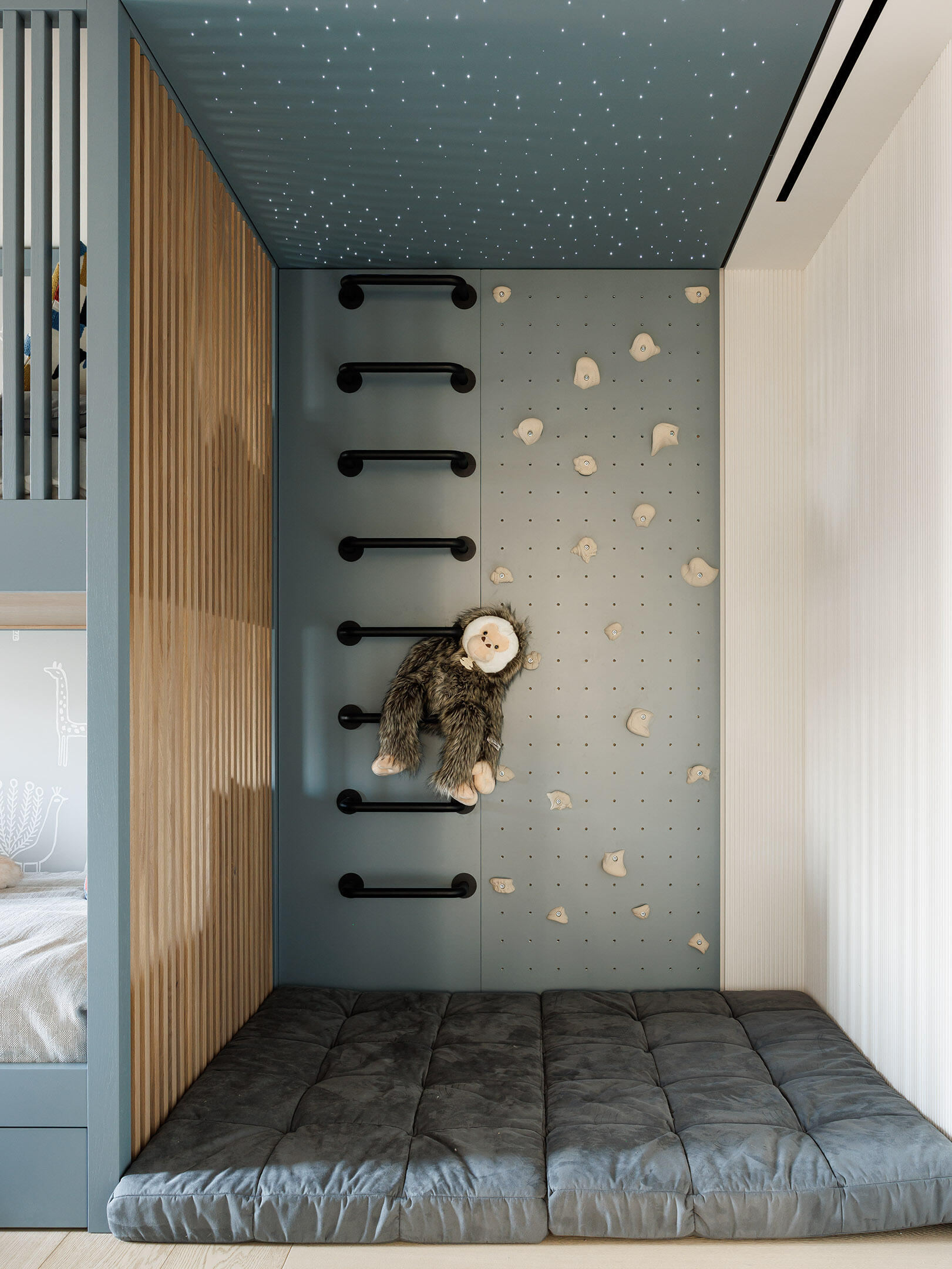 Для шестилетнего ребенка мы создали не просто комнату, а целый мир для приключений. Мы сразу отказались от идеи «детской на пару лет» и реализовали интерьер, который легко трансформируется под нужды подростка. В центре внимания оказалась крутая двухъярусная зона: сверху мы натянули канатную сетку, а рядом закрепили настоящий скалодром.
