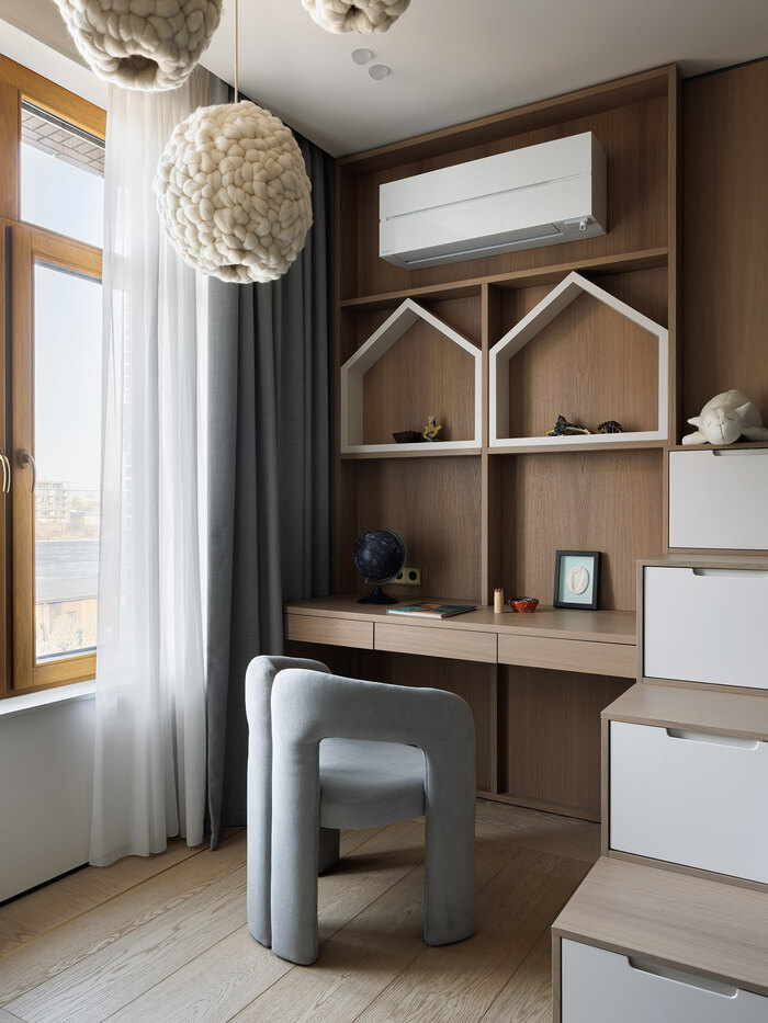Чтобы в комнате осталось как можно больше места для игр, мы выделили отдельную гардеробную прямо внутри детской. Теперь все игрушки и вещи Льва хранятся там, а в основной зоне царит порядок. Весь интерьер наполнили мягкими природными цветами и тактильными материалами, так что комната получилась очень уютной и безопасной.
