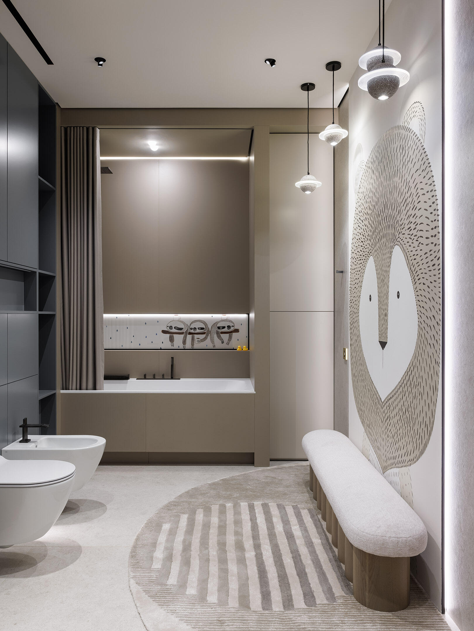 Мы обеспечили личный комфорт каждому члену семьи. Вместо двух стандартных санузлов мы реализовали три независимые зоны: для хозяйки, сына и гостей. Мастер-ванную перенесли в бывшую жилую комнату, чтобы поставить чашу прямо у окна и добавить естественный свет. Все бытовые процессы и технику мы спрятали в отдельную постирочную рядом с холлом. Это позволило разгрузить жилые зоны от визуального шума и хозяйственных вещей.