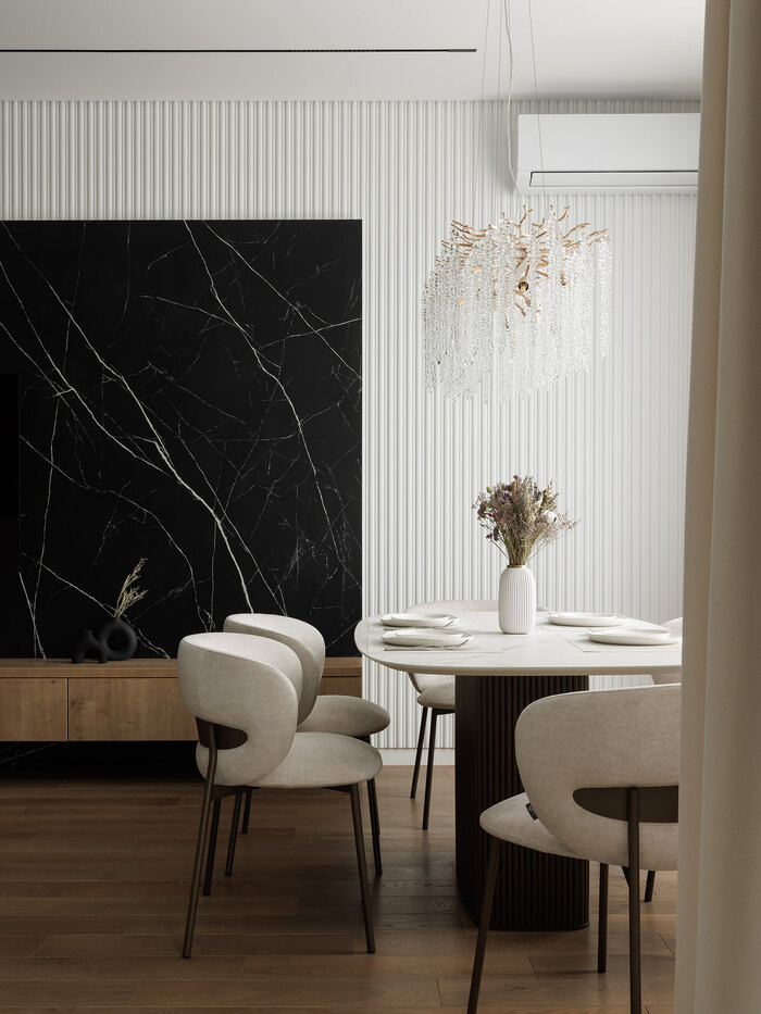 В интерьере использованы тактильно приятные и практичные материалы, создающие сбалансированную среду для жизни.