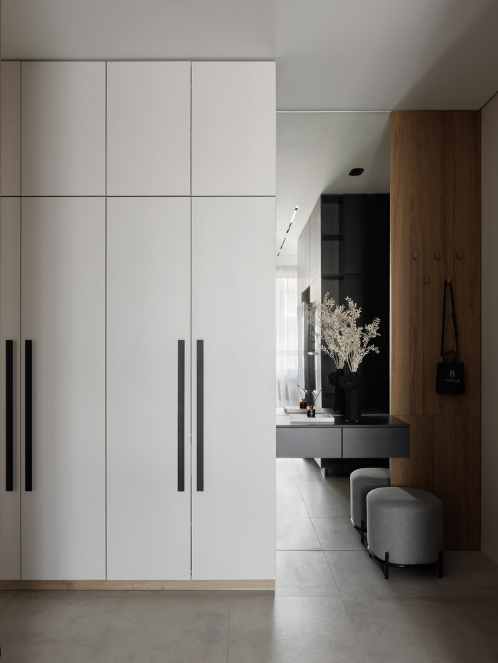 В холле организовали зону хранения: разместили длинный шкаф для одежды, консоль с зеркалом, пуфом и вешалками. За счёт перепланировки удалось увеличить площадь гостевого санузла и встроить в него нишу для стиральной и сушильной машин. В спальне предусмотрен полноценный гардероб, интегрированный в общую архитектуру помещения.