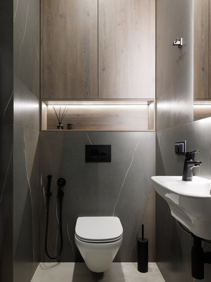 Гостевой санузел стал одновременно и постирочной: здесь предусмотрен шкаф для стиральной и сушильной машин. Отделка — в духе проекта: тёплая, с выразительными деталями. Эргономика продумана до мелочей. Трековое освещение добавляет мобильности.