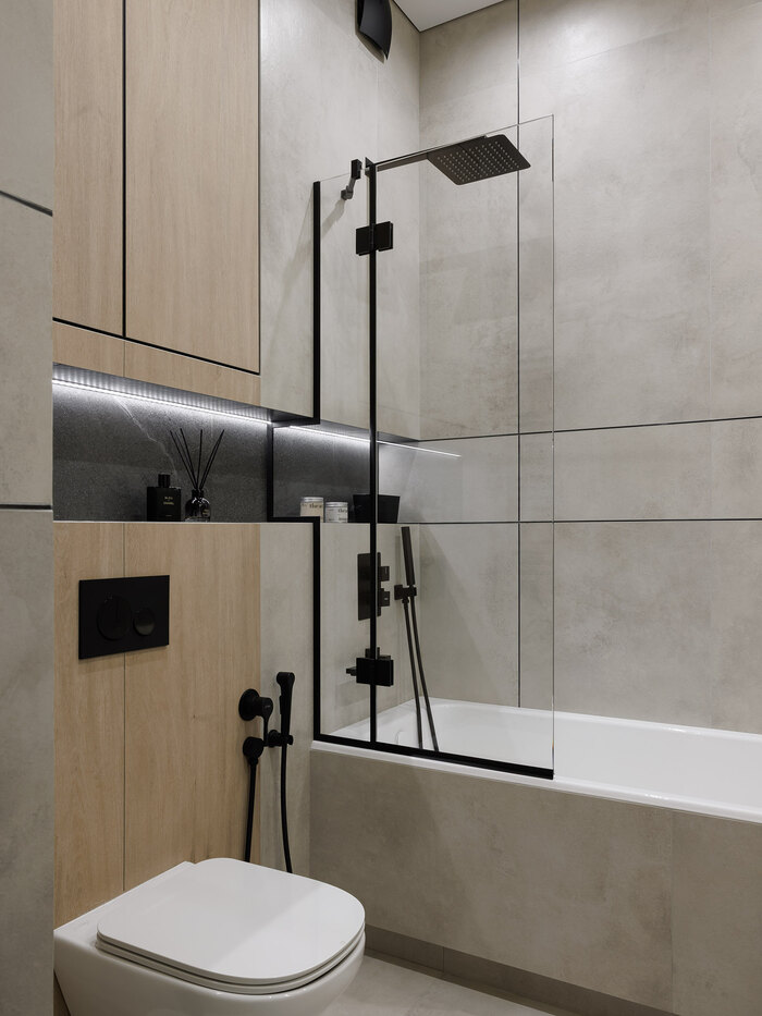 Основной санузел оформлен с графичным акцентом — широкие швы между плиткой заполнены чёрной эпоксидной затиркой, что придаёт отделке выразительность. Здесь продумана система хранения и размещения сантехники, всё лаконично и тактильно приятно. Освещение — комбинированное, мягкое.