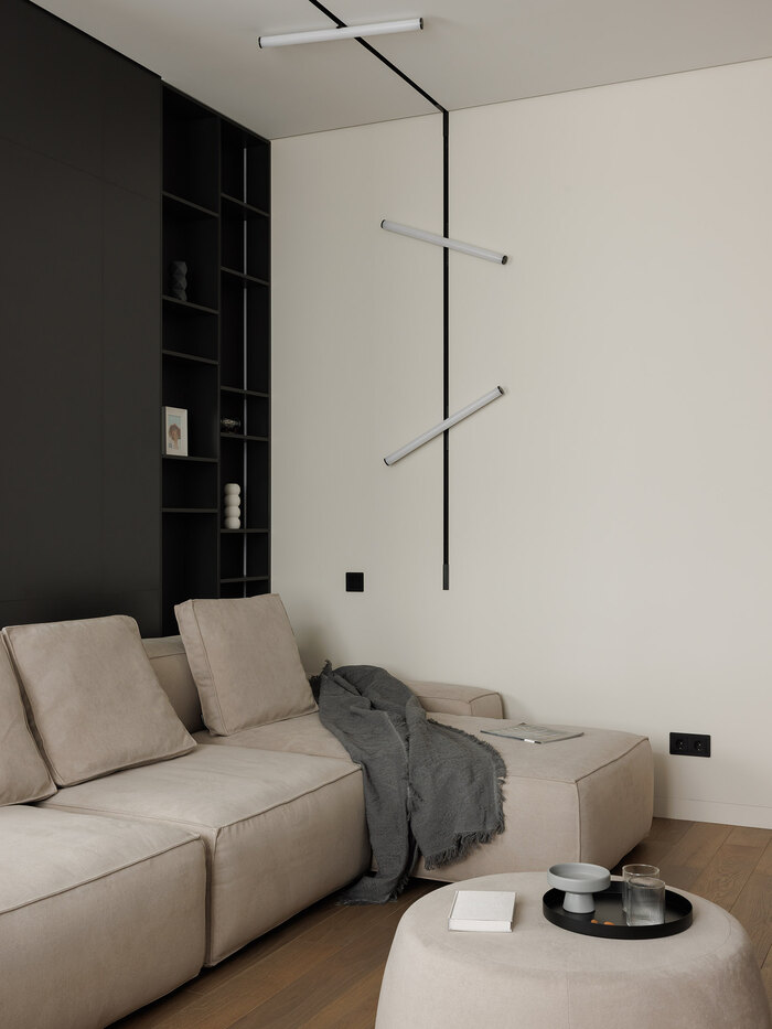Интерьер квартиры выполнен в современном стиле — сдержанном, светлом с темными акцентами.