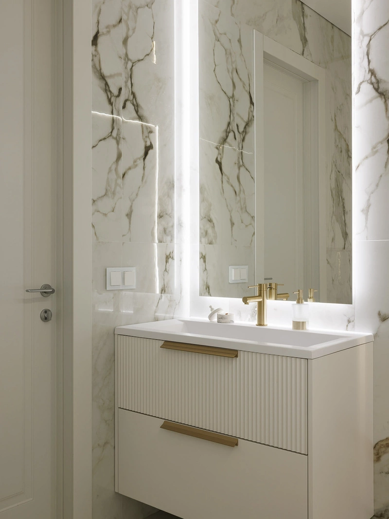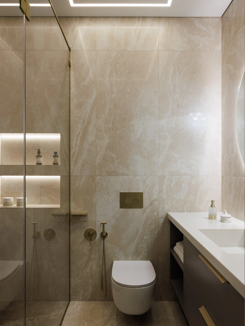 Основная отделка — керамогранит под мрамор в светло-серых и бежевых тонах. Он практичен, не боится влаги и легко очищается.
