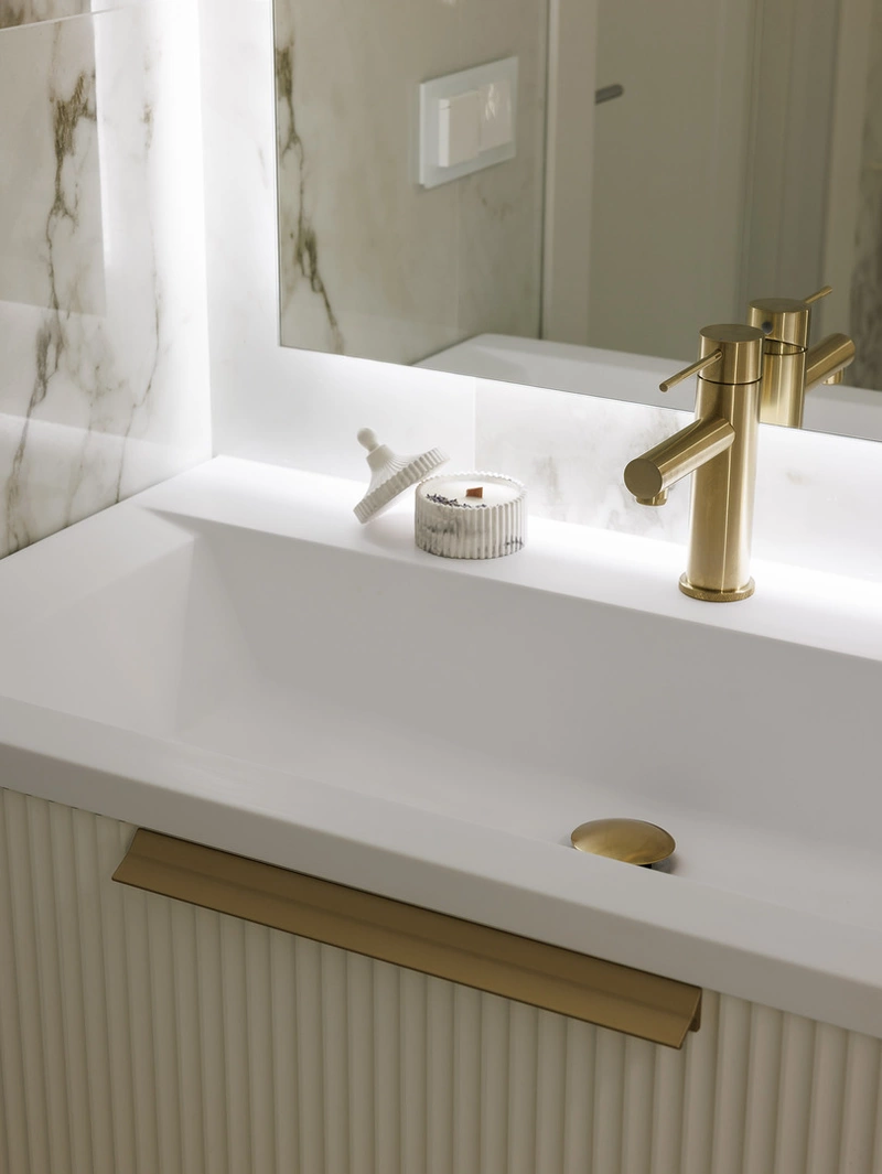 Тумба под раковиной — с рифлёными фасадами и вместительными ящиками. В ней удобно хранить полотенца и косметику, сохранять порядок.