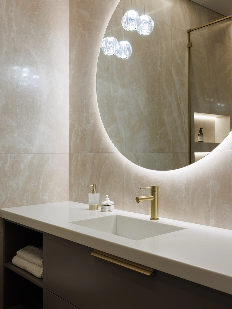 Для отделки выбрали крупноформатный керамогранит под камень в тёплом бежевом оттенке. Он визуально расширяет помещение и делает интерьер цельным.