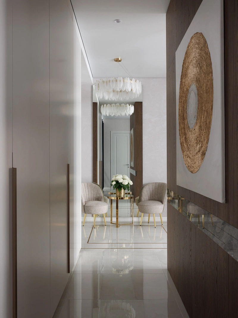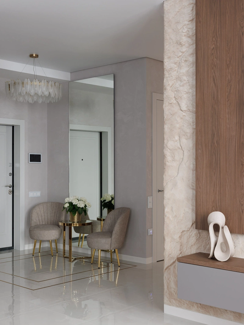 В глубине прихожей оформлена зона ожидания с креслами и зеркалом в полный рост. Это не только удобно, но и визуально расширяет пространство: отражения света делают коридор светлее и глубже.