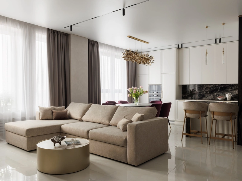 Интерьер выполнен в современном стиле. В отделке преобладают светлые нейтральные тона: молочный, тёплый беж, серо-песочный и мягкий серый. Их дополняют акценты натурального дерева и фактуры камня — они придают пространству глубину и ощущение тепла.