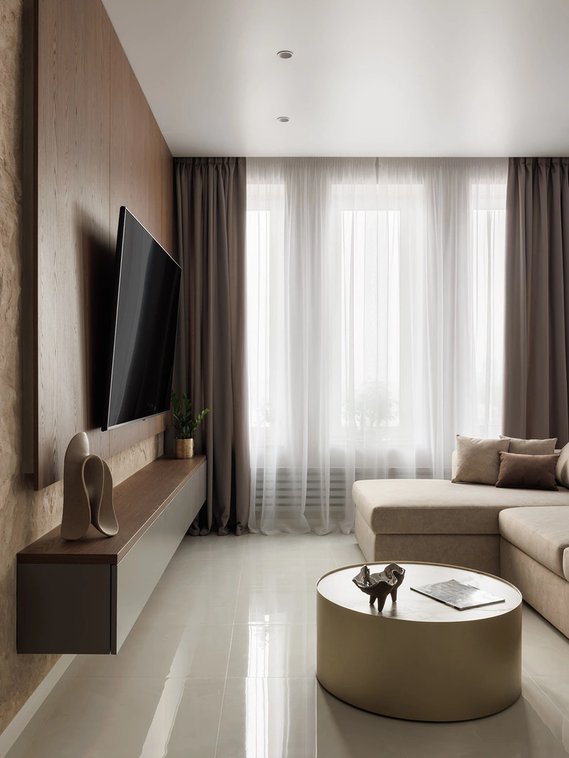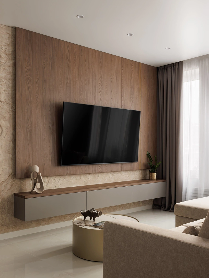 ТВ-зону оформили панелями под дерево и декоративным камнем. Это решение добавило тепла и визуального объёма, при этом все материалы практичные — легко ухаживать, не боятся пыли и влаги.