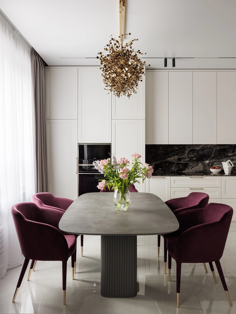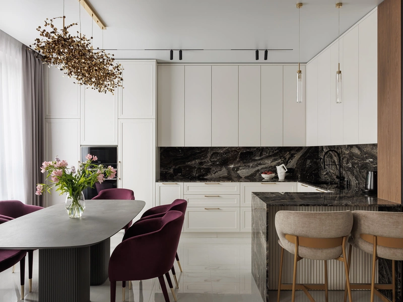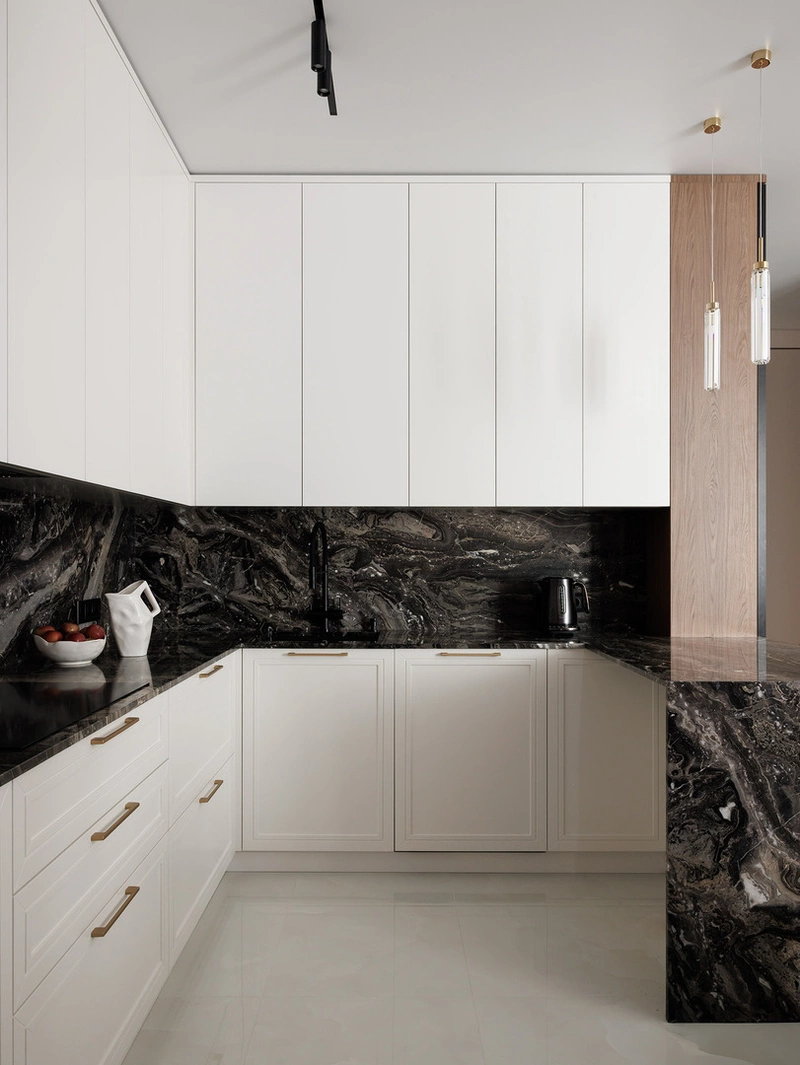 Фартук и столешница из тёмного камня создают выразительный акцент и при этом практичны: материал не боится влаги, легко моется и не выцветает со временем.