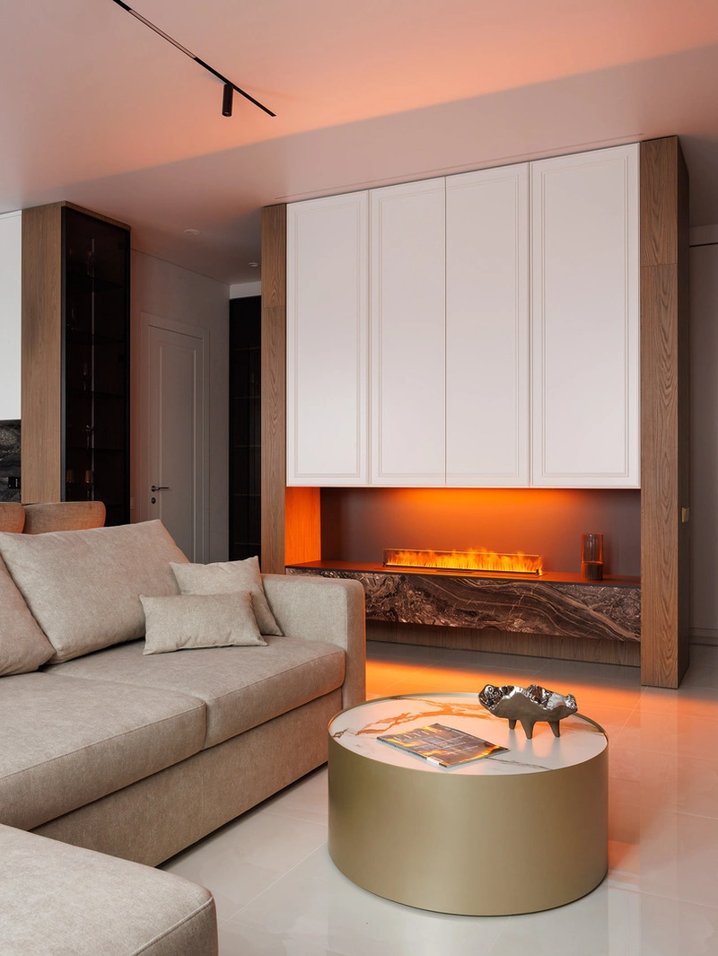 Эффектная зона камина в гостиной — стала архитектурным центром квартиры и задала настроение всему пространству.