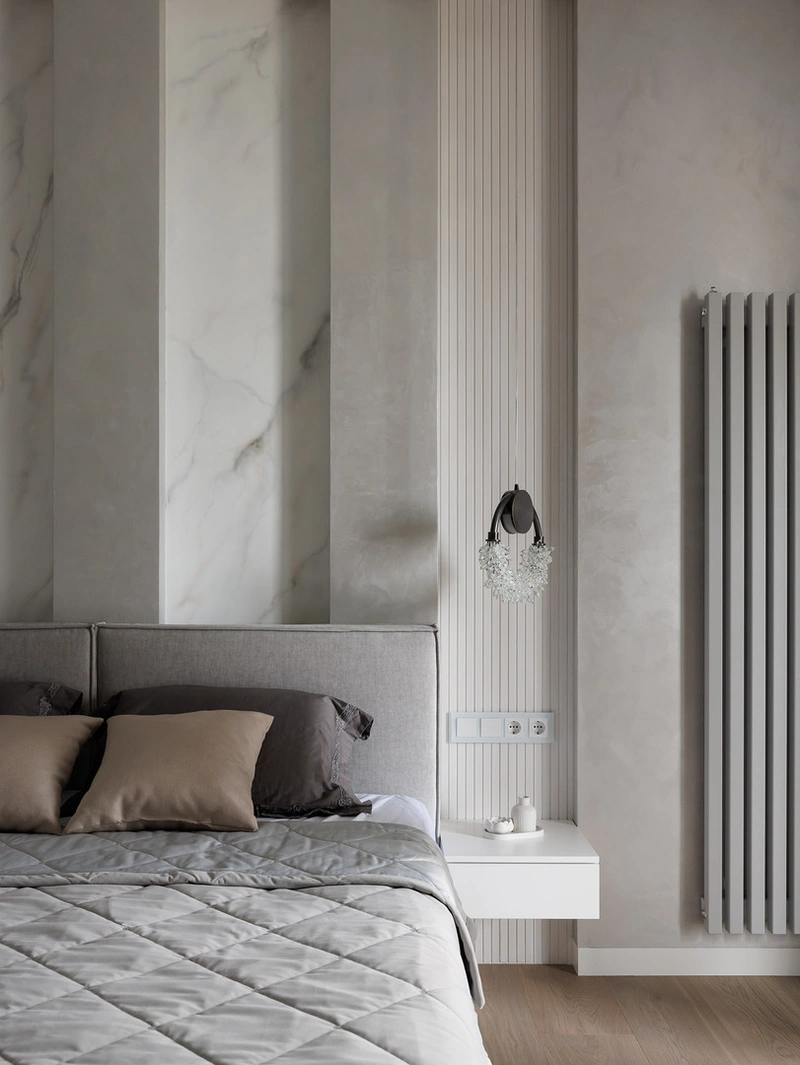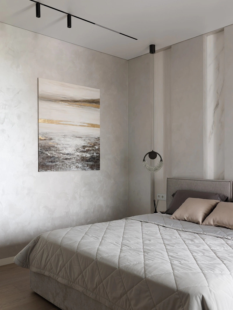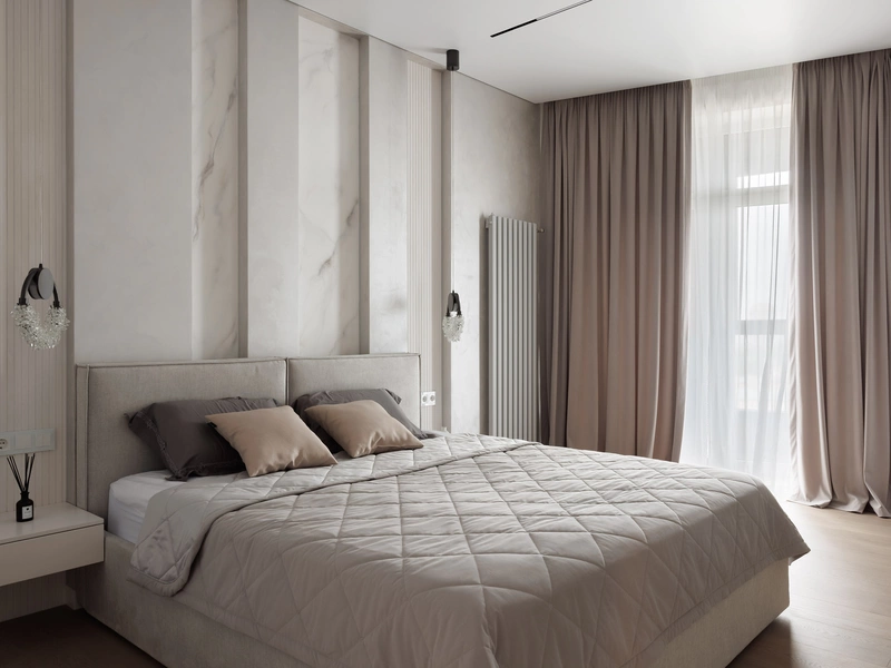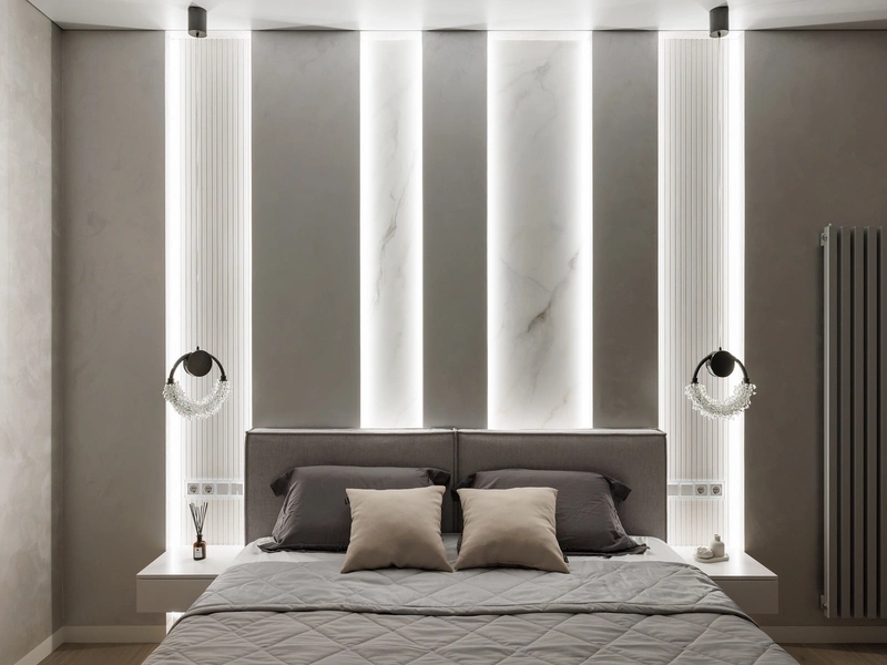 Сама спальня выполнена в сдержанной серо-бежевой гамме. Стена за кроватью оформлена декоративными панелями с мягкой подсветкой и вставками под мрамор — приём добавляет глубины и делает интерьер более выразительным.