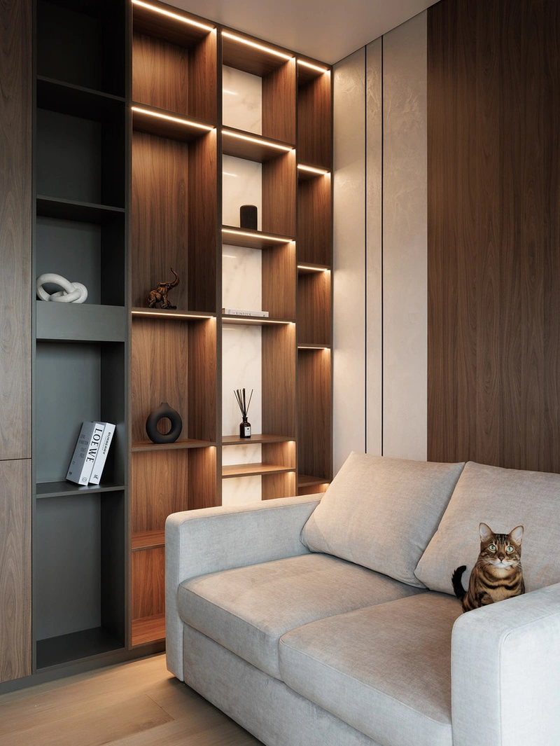 3D-панели и мебельные панели — использованы в отделке стен и встроенной мебели. Они добавляют фактуру, ритм и делают интерьер визуально цельным.