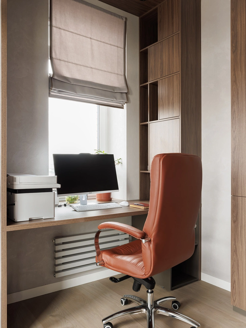 По одной из стен размещена система стеллажей с подсветкой — она используется и для хранения документов, и как элемент декора. Тёплое дерево и графитовые ниши создают спокойную атмосферу, в которой легко концентрироваться.