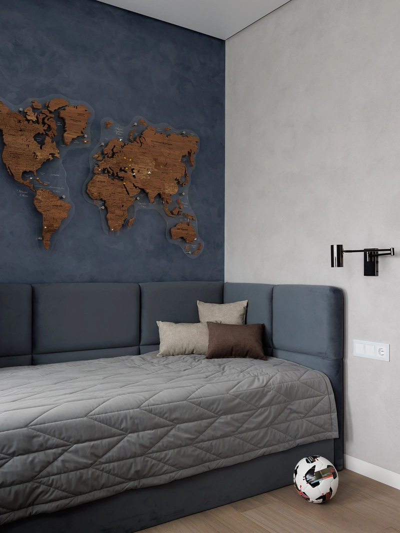Кровать расположена у тёмно-синей акцентной стены, которая добавляет глубины и создаёт спокойный фон. Мягкое изголовье защищает стену и делает спальное место комфортным.