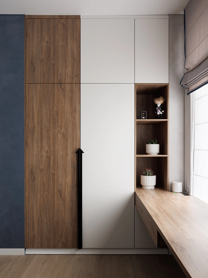 Сбоку — встроенные открытые полки и шкафы до потолка. В них можно хранить книги, игрушки и спортивные вещи — всё под рукой, но не на виду.