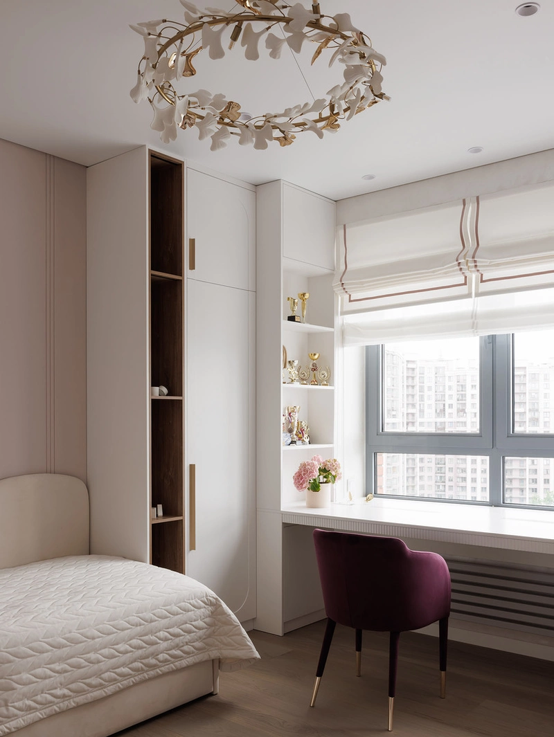 Для этого часть площади спальни выделили под гардеробную. Поставили перегородку и встроенные шкафы до потолка. Внутри всё организовано по категориям: длинные вещи, повседневная одежда, обувь и закрытые полки для хранения сезонных предметов. Это позволило отказаться от громоздких шкафов в основной части комнаты.