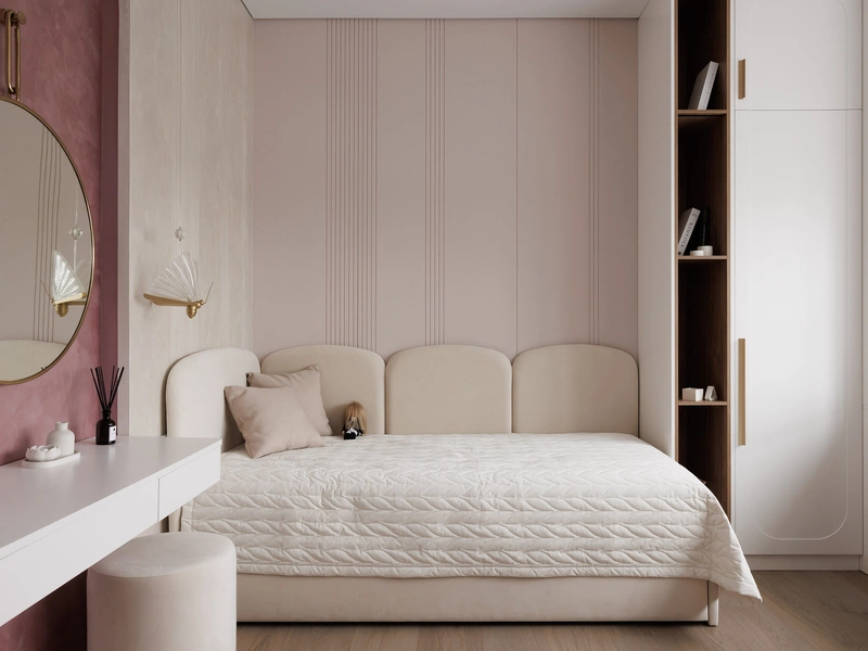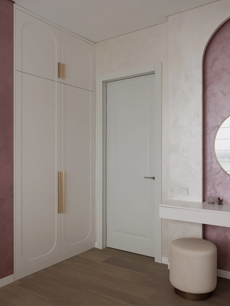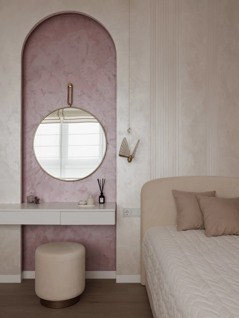 Акцентная деталь — арка с подсветкой и зеркалом у туалетного столика. Она создаёт мягкое свечение и делает комнату более атмосферной.