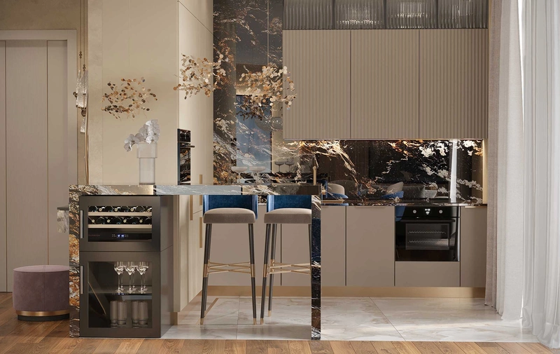 Кухня оформлена в современном стиле с акцентом на роскошь и утонченность. Барная стойка с подвесными светильниками стала стильным акцентом, который подчеркивает современный характер интерьера.
