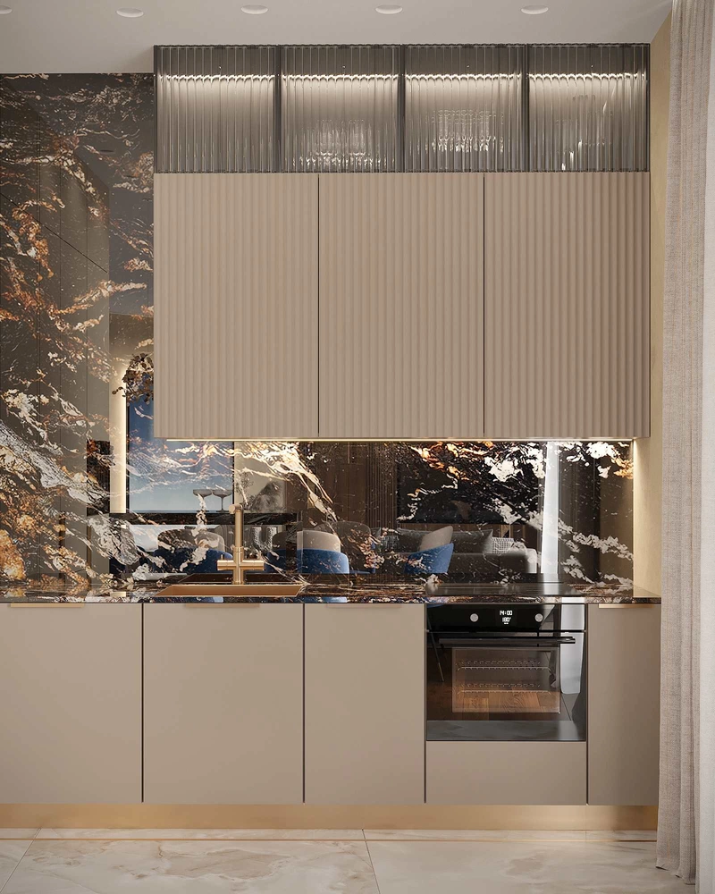 Мраморный фартук с выразительным природным рисунком, где темные и золотистые акценты создают эффект динамики и глубины. Столешница и фартук объединены единой каменной структурой, что визуально связывает зоны готовки и хранения.