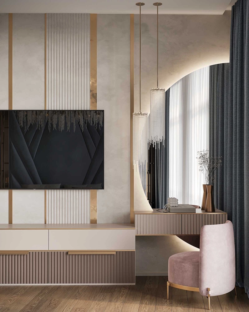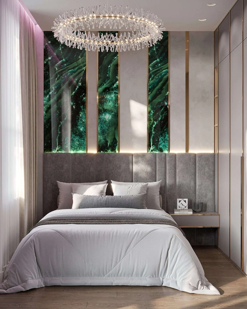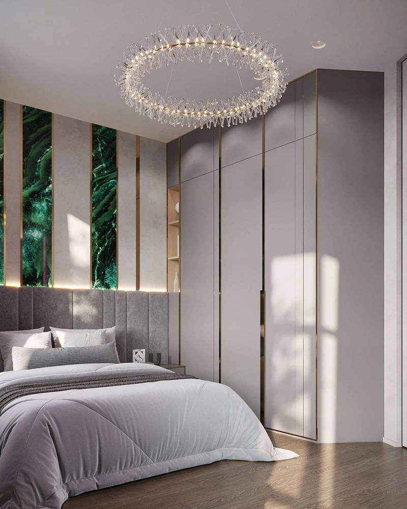 Спальня оформлена в мягкой, спокойной палитре с акцентом на глубоком синем цвете. Изголовье кровати украшено бархатной геометрической панелью. Натуральные материалы, зеркальные вставки и мраморные панели добавляют интерьеру роскоши. Легкий текстиль в серых и пудровых тонах смягчает обстановку. Люстра с хрустальными элементами подчеркивает элегантность интерьера.