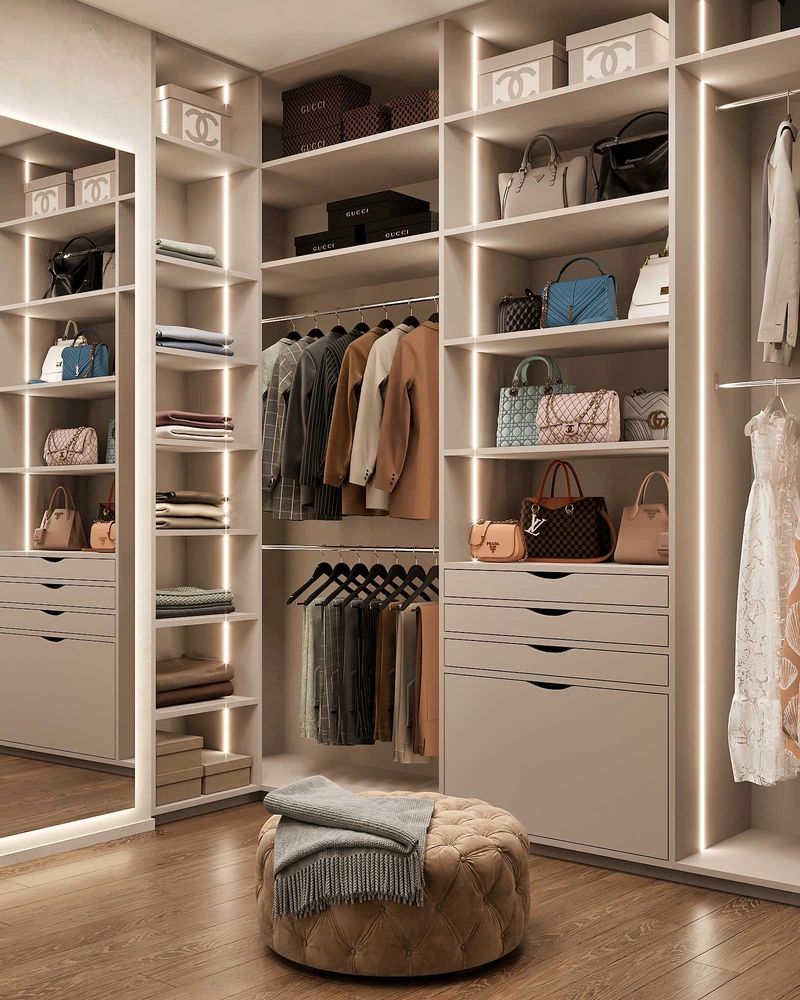 - Организовать мастер-зону с гардеробной и ванной, полностью отделённую от активных зон квартиры.