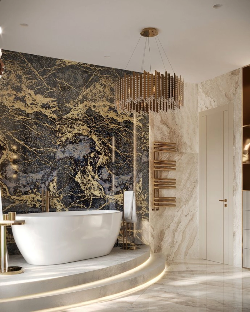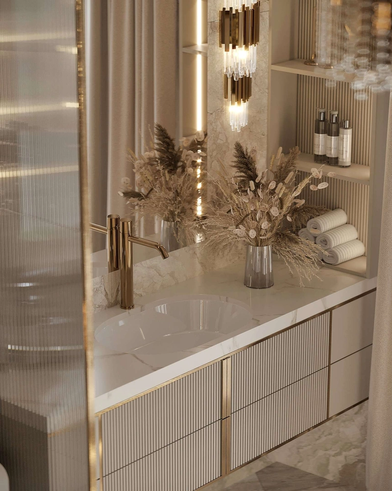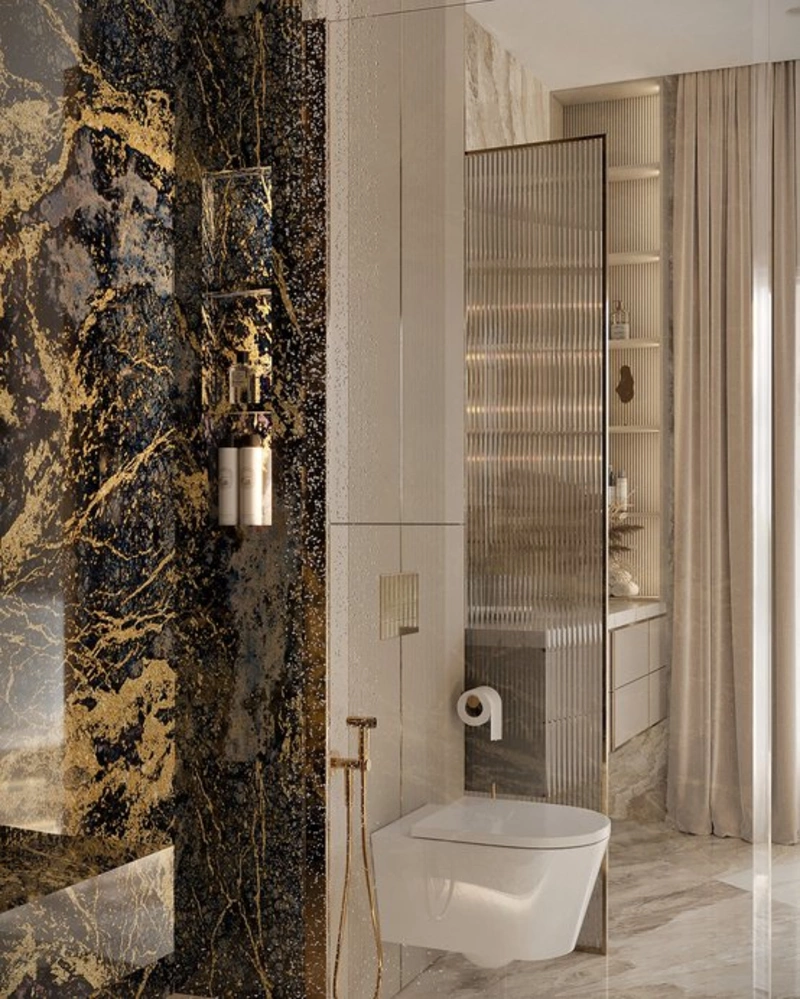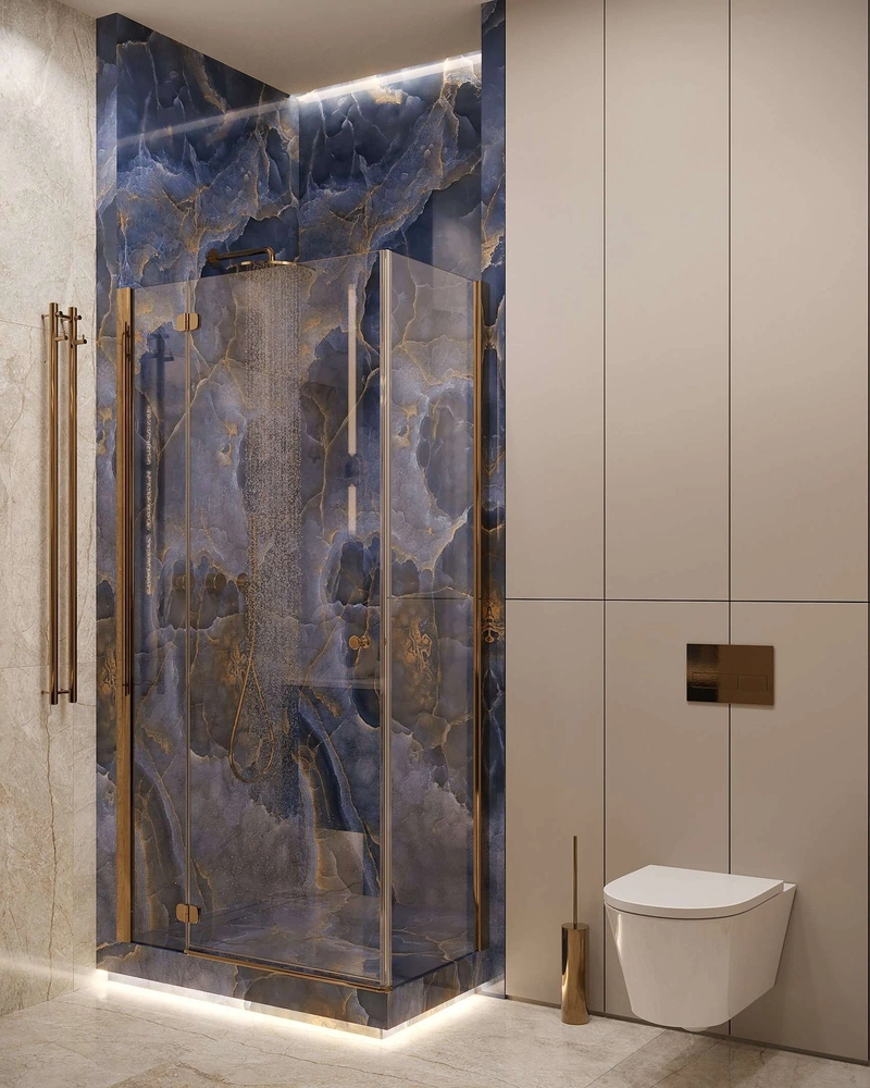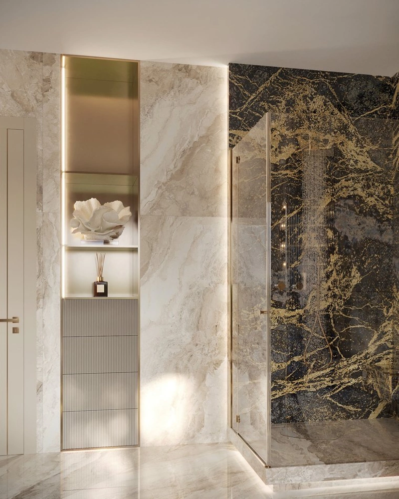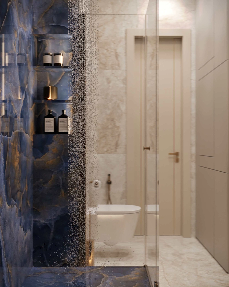 Санузел при мастер-спальне оформлен мраморными плитами с выразительной текстурой. Ванна у окна создает ощущение уединенности и комфорта. Отдельная душевая зона с прозрачными перегородками добавляет легкости. Встроенная подсветка делает интерьер более объемным и атмосферным.